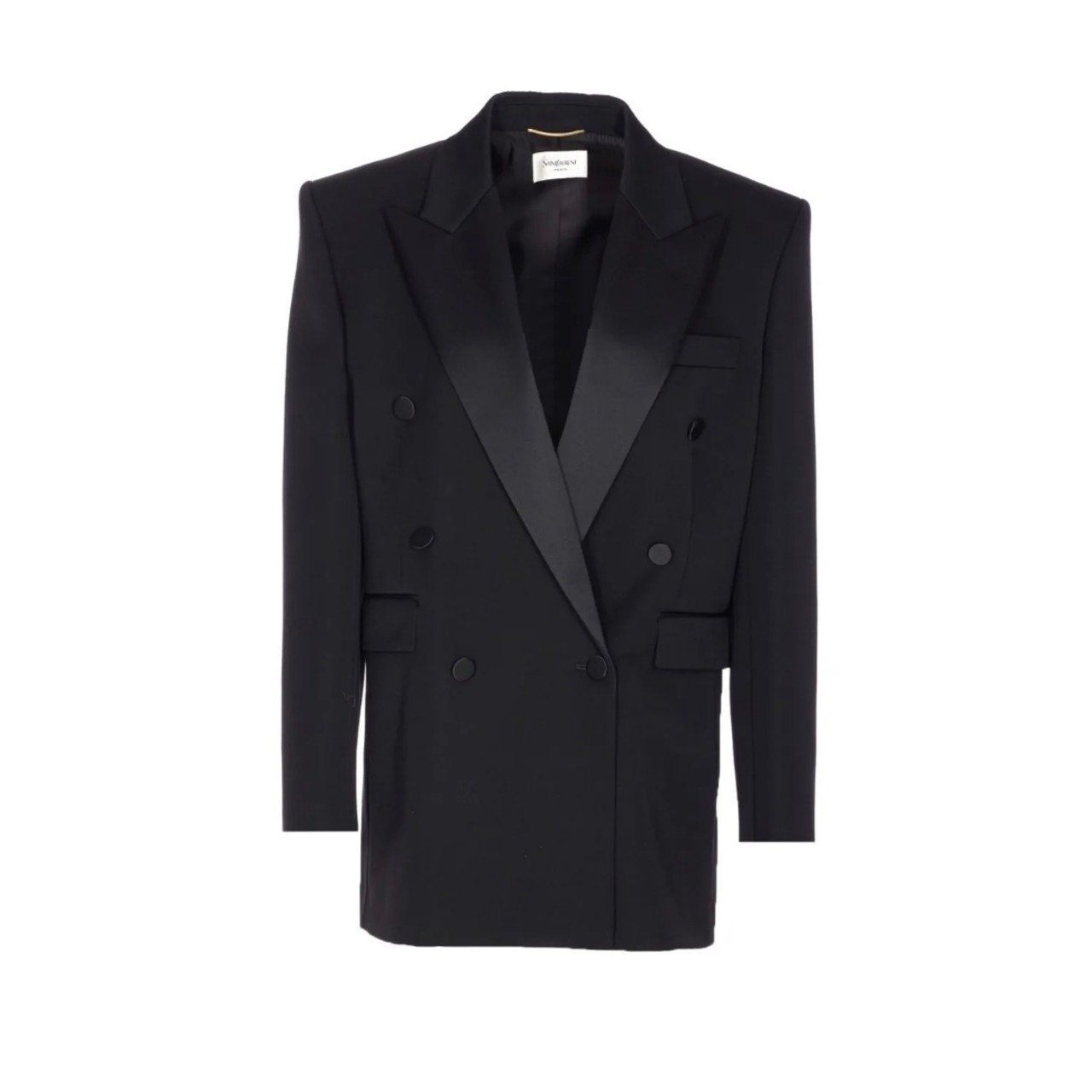 サンローランのグレイン・ド・プードルダブルブレストタキシードジャケット。認証ウールの6つボタン留め、サテンのピークドラペルとサテン張りのボタン、シルクの裏地、フロントにフラップウェルトポケット2つ、胸ポケット1つ、4つボタンの袖口、パッド入りの肩、背面にダブルベンツ