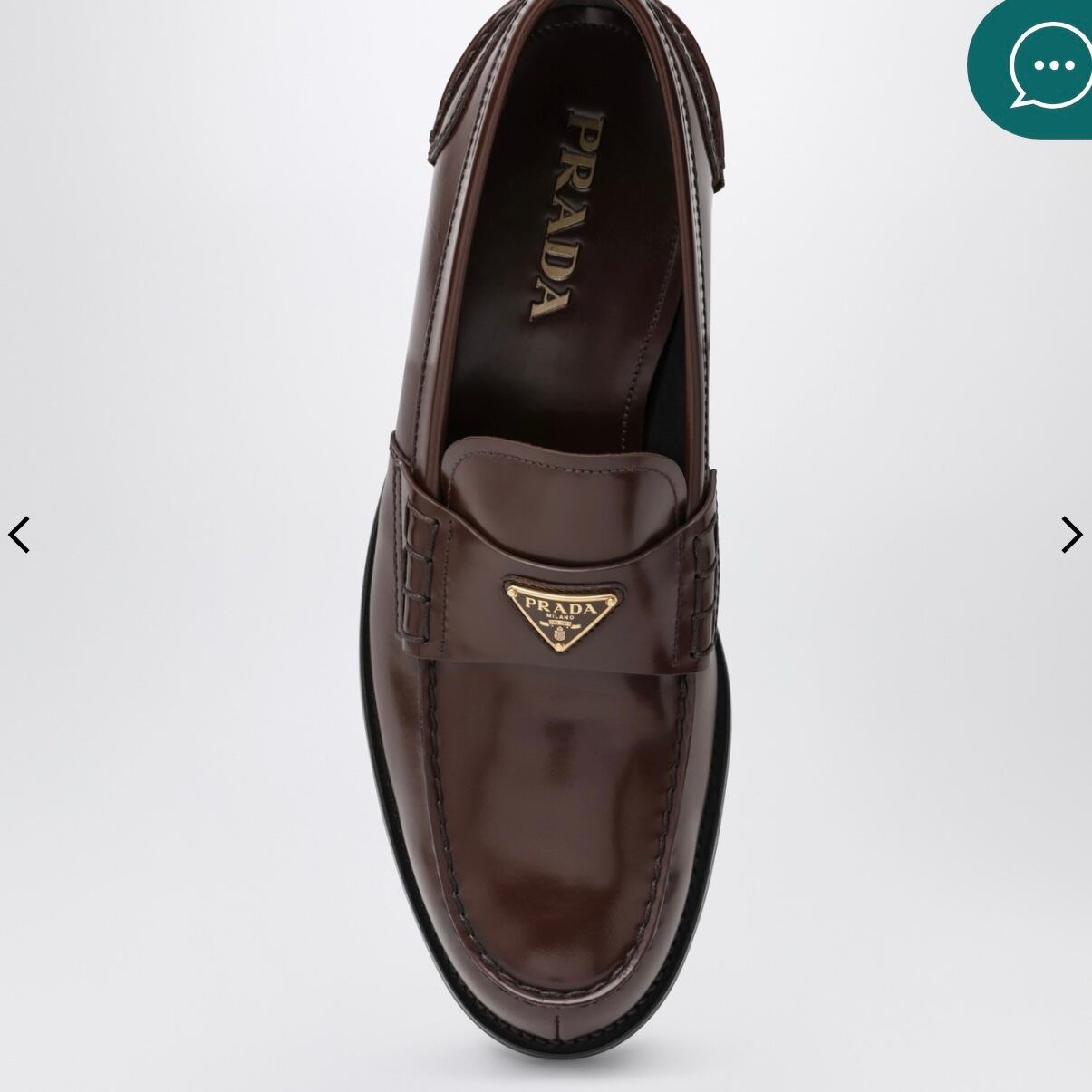 ラディカカラーのブラッシュドレザーを使用したプラダのモカシン。エナメルメタルの 三角形のロゴが付いたストラップとレザーソールが特徴です。