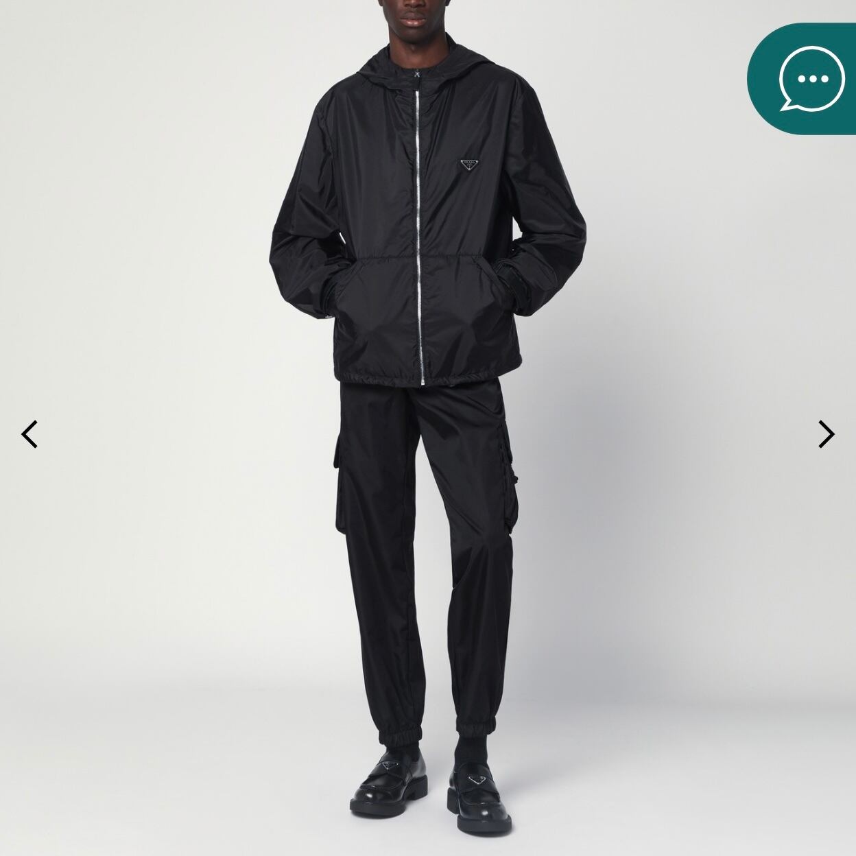ブラックのRe-Nylonを使用したプラダのジャケット。フロントにエナメル加工の トライアングルロゴ、レギュラーフィット、フード、長袖、ベルクロ とドローストリングで調節可能な袖口、目に見えるジッパー開閉、サイドポケット2つ、 ストレートヘム、伸縮性のあるドローストリング。