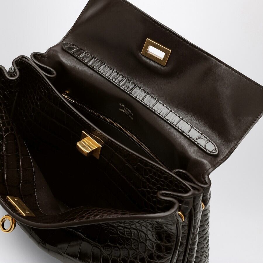 クロコダイル調のダークブラウンのカーフスキンで作られたバレンシアガの小型ハンドバッグ。トップハンドル、取り外し可能なショルダーストラップ、取り外し可能なレザーキーチェーン(オープンリング2個付き)、アンティークゴールドのメタルハードウェア、ターンロック開閉、メインコンパートメント1つ、内側にジッパーポケット1つ、背面にフラットポケット2つ、サイドにスナップボタン4つ、真鍮製の脚4つが付いています。