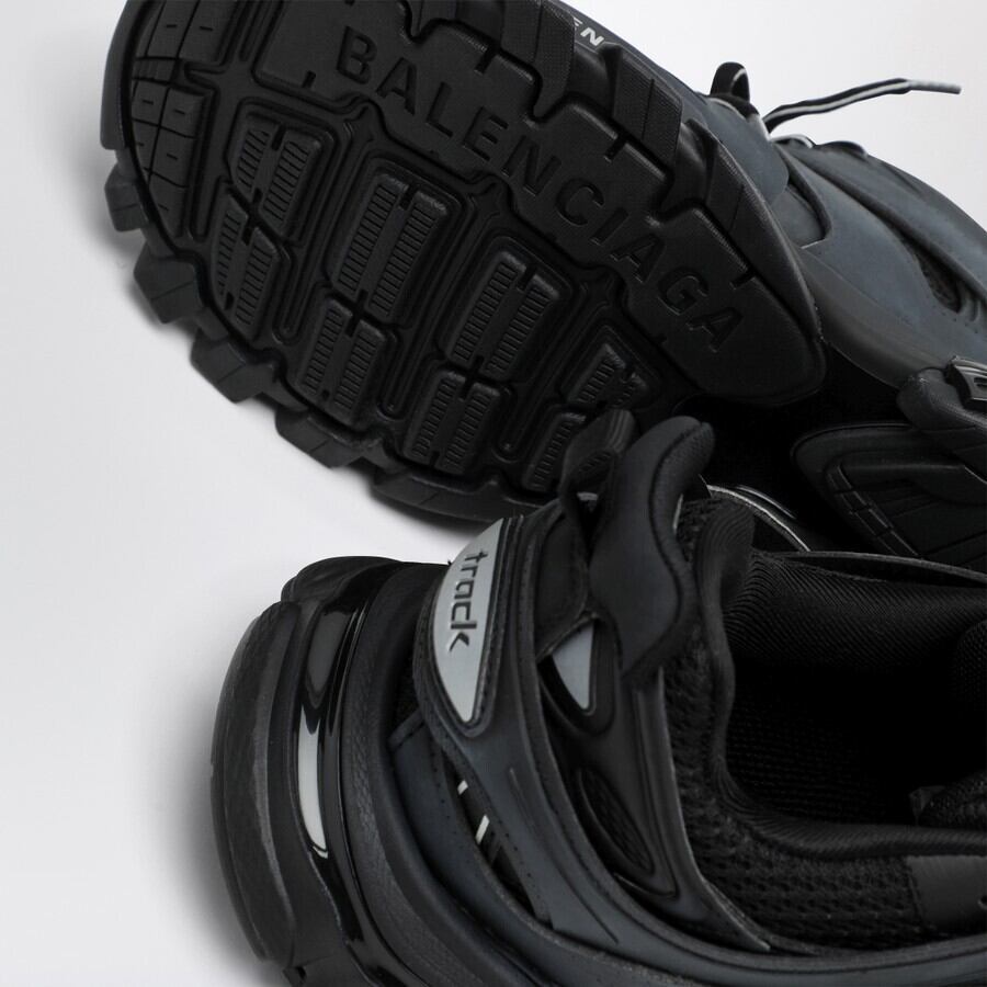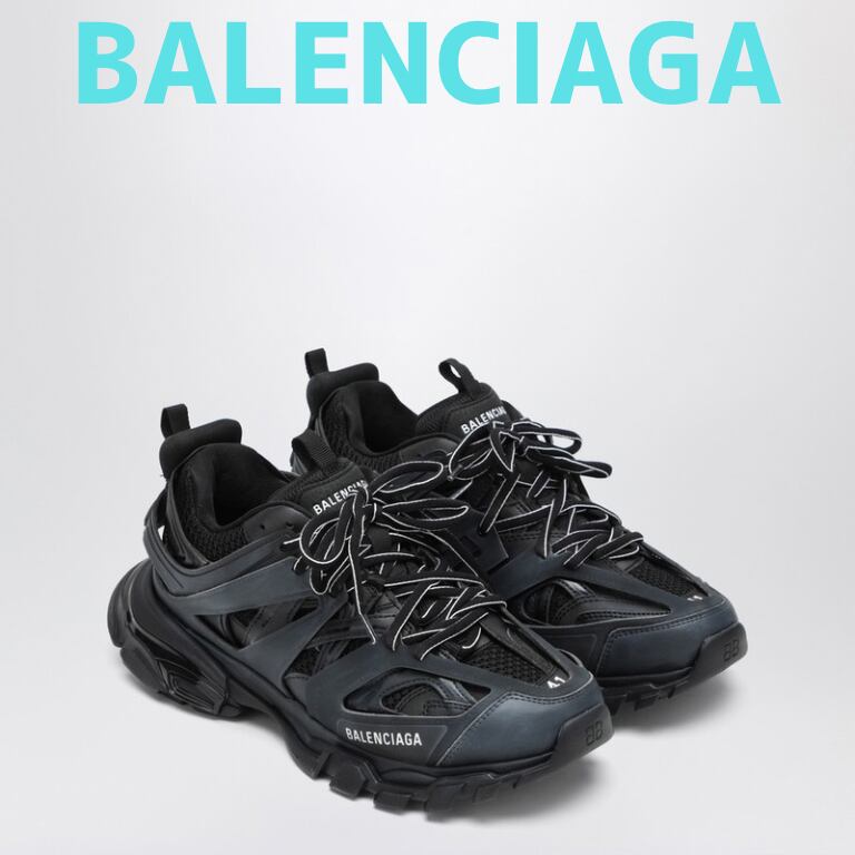 メッシュとナイロンを使用したバレンシアガのブラックスニーカー。ダイナミックなデザイン、レースアップクロージャー、コントラストのロゴプリント、ラバーソールが特徴です。