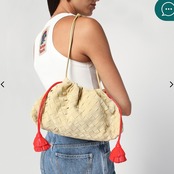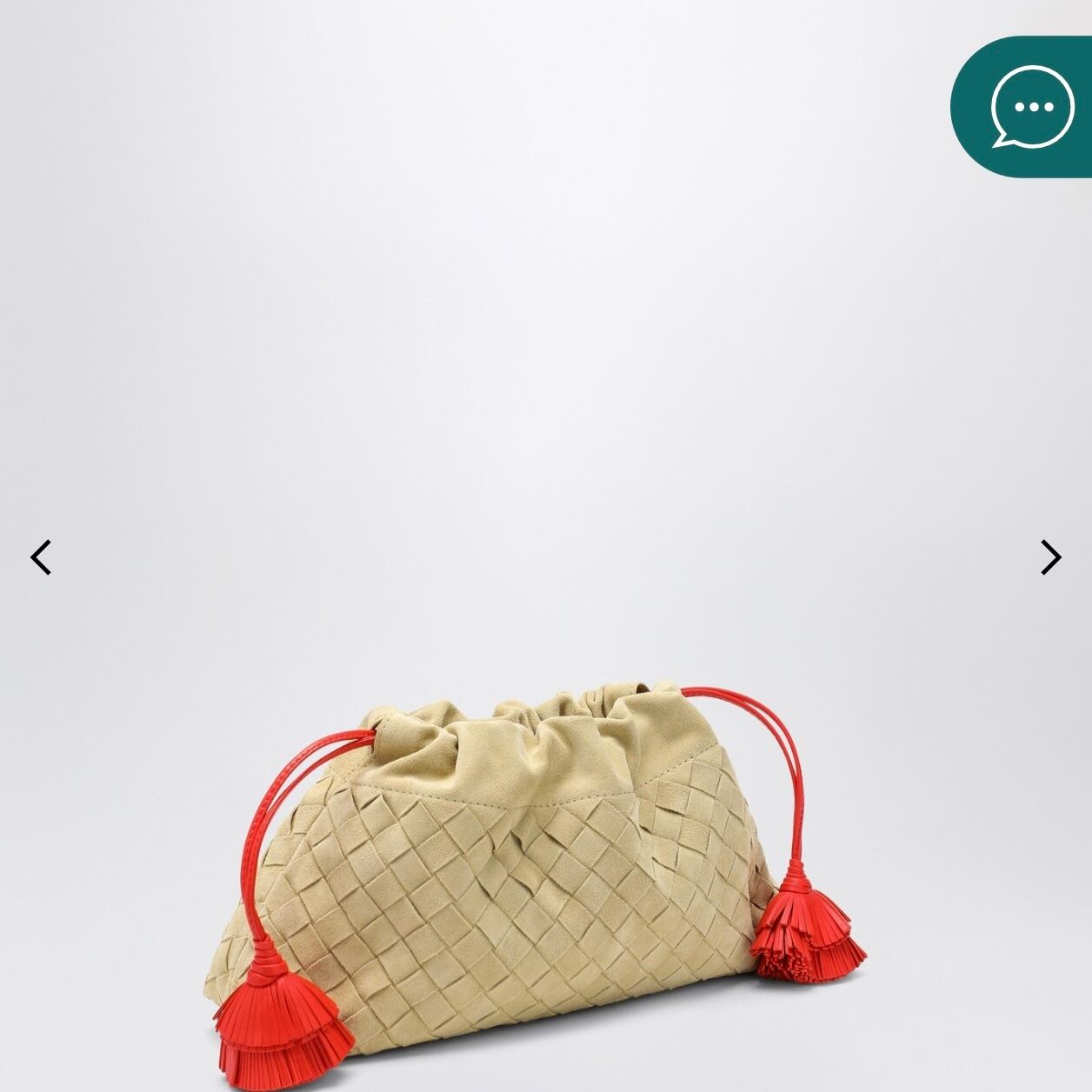 ボッテガ・ヴェネタのスエードポーチ。タピオカカラーのイントレチャート 模様。タッセル付きの赤いレザードローストリング、細いショルダー ストラップ、メインコンパートメントが特徴です。
