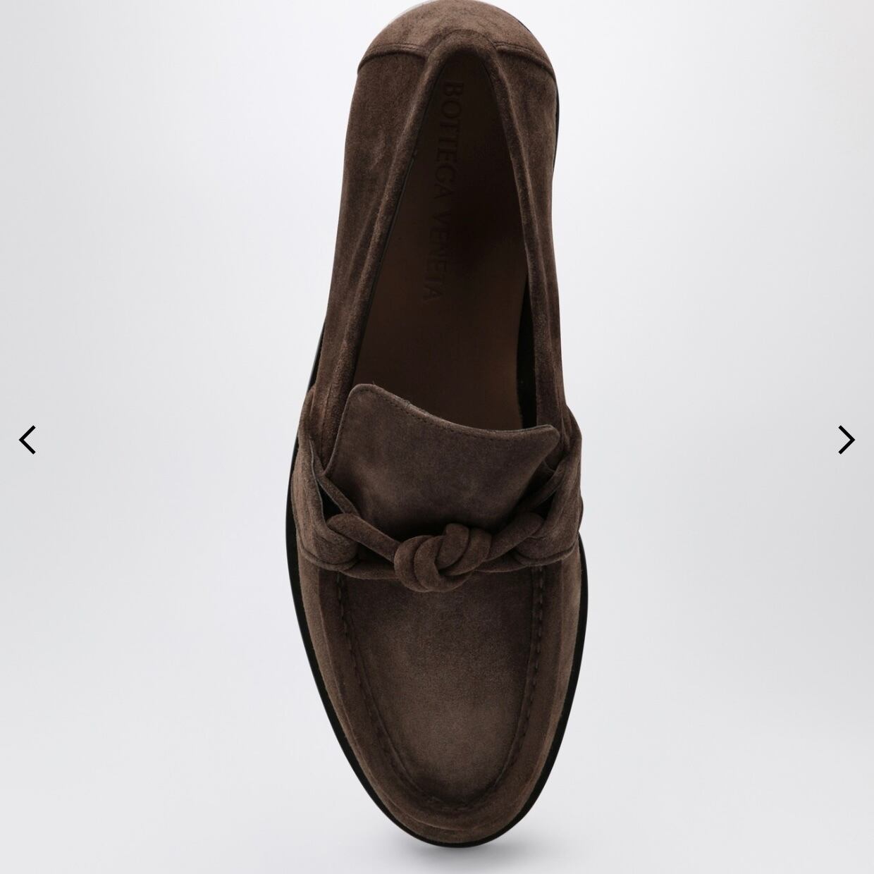 フォンデンテカラーのスエードカーフスキンを使用したボッテガ・ ヴェネタのモカシン。フロントのノットディテール、コントラストの効いたステッチ、 レザーソールが特徴です。