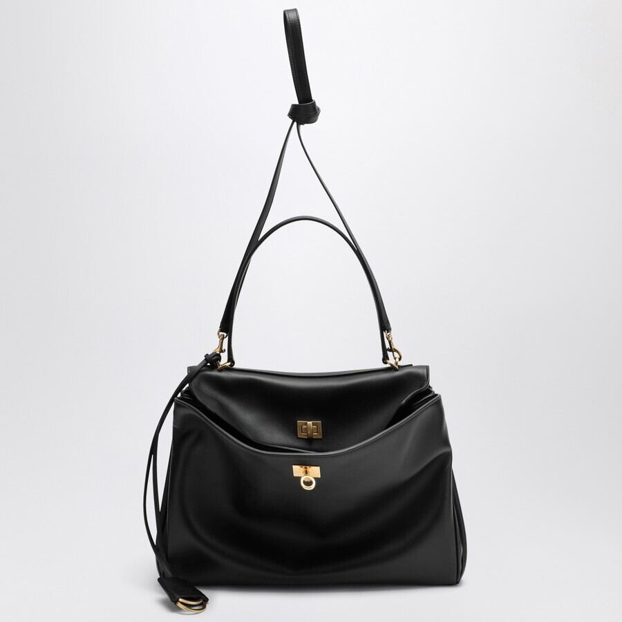 バレンシアガのブラックのスムースカーフスキンレザーを使用したミディアムバッグ。トップハンドル、取り外し可能なショルダーストラップ、取り外し可能なレザーキーリング(オープンリング2個付き)、アンティークゴールドトーンのメタルハードウェア、スイベル留め具、メインコンパートメント、内側にジッパー付きポケット、背面にフラットポケット2個、サイドにプレススタッド4個、真鍮製の脚4個が付いています。