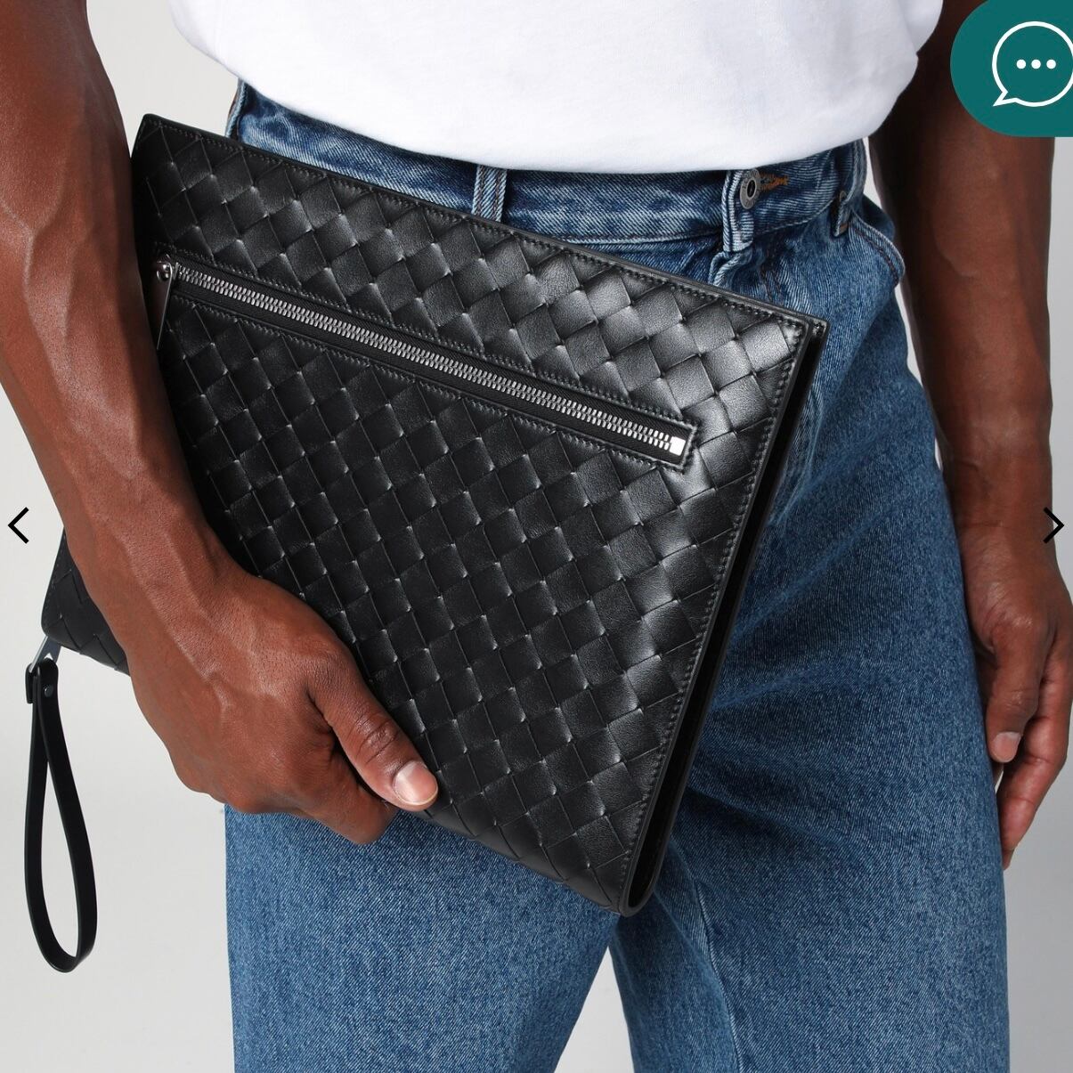 ボッテガ・ヴェネタのブラック イントレチャート ドキュメントホルダー。 三方ファスナー開閉、複数のカードスロット、シルバーカラーの金具、リスト ストラップ付き。