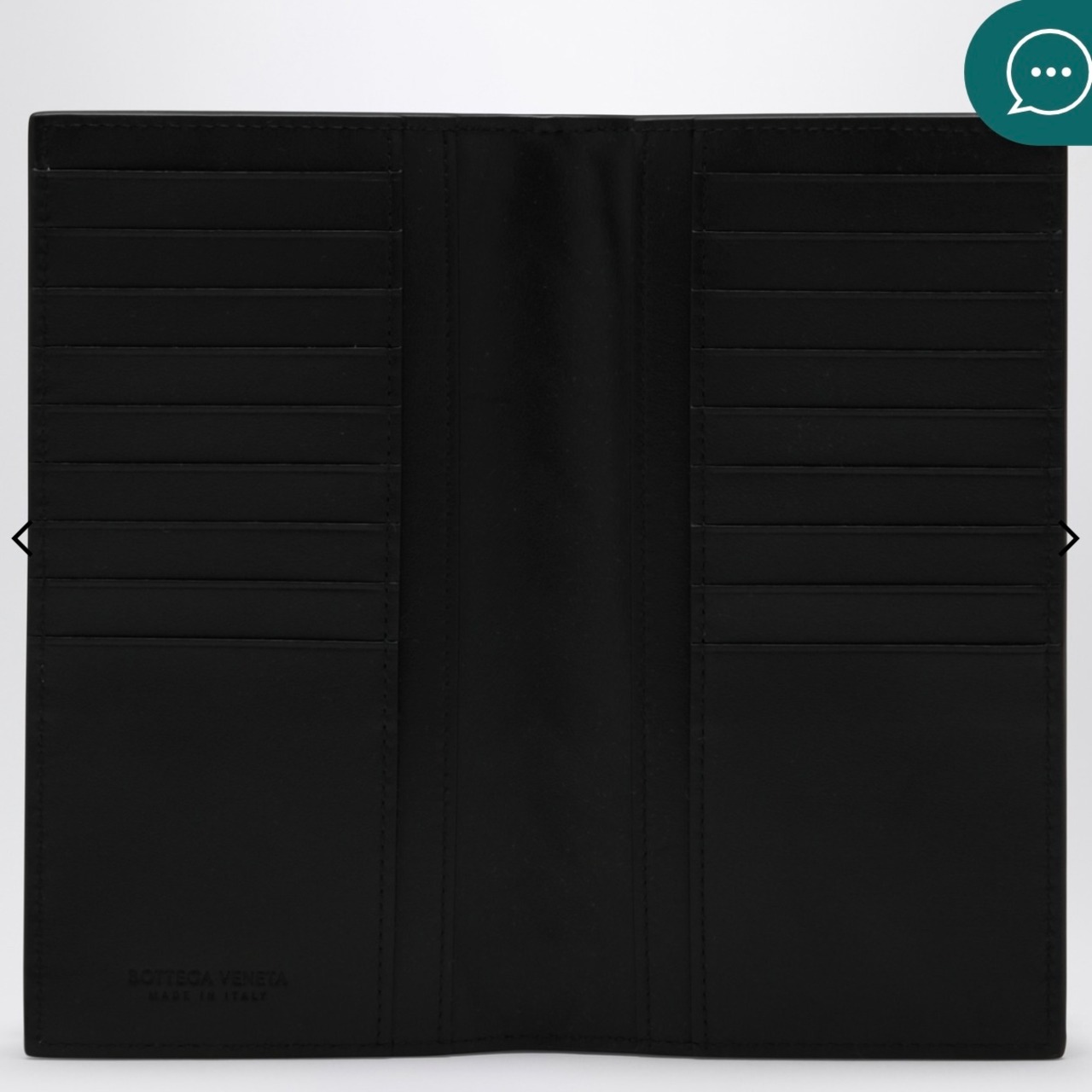 ボッテガ・ヴェネタのブラックレザー縦型カードホルダー。 イントレチャート模様と18個の内側カードスロット、サイドスロットが特徴です。
