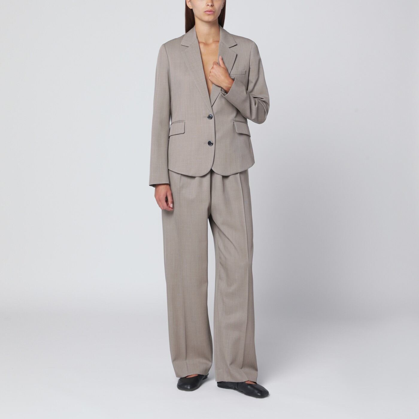 ロエベのベージュメランジウール&シルクトラウザーズ。フロントにギャザーを寄せ、レザーベルトをあしらいました。ミッドライズウエスト、ストレートレッグ、サイドジップ開閉、サイドポケット2つ、バックにボタン付きウェルトポケット1つ、フロントプレスプリーツ、バックにレザーロゴレタリングパッチ、レギュラーフィットが特徴です。