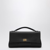 ブラックのスムースカーフスキンを使用したバレンシアガポーチ。トップハンドル、取り外し可能なショルダーストラップ、ターンロック開閉、開閉システムに刻印されたロゴ、メインコンパートメント、内側のカードスロット 4つ、ジッパー付きバックポケット、アンティークゴールド仕上げが特徴です。