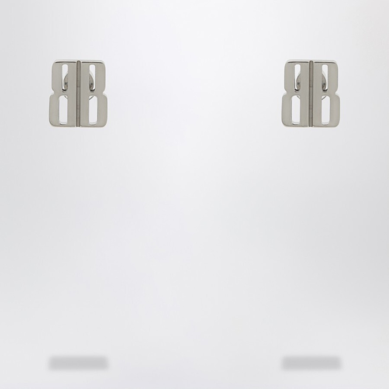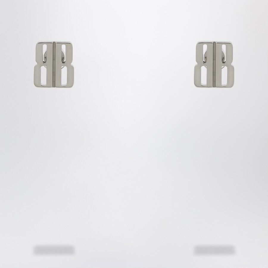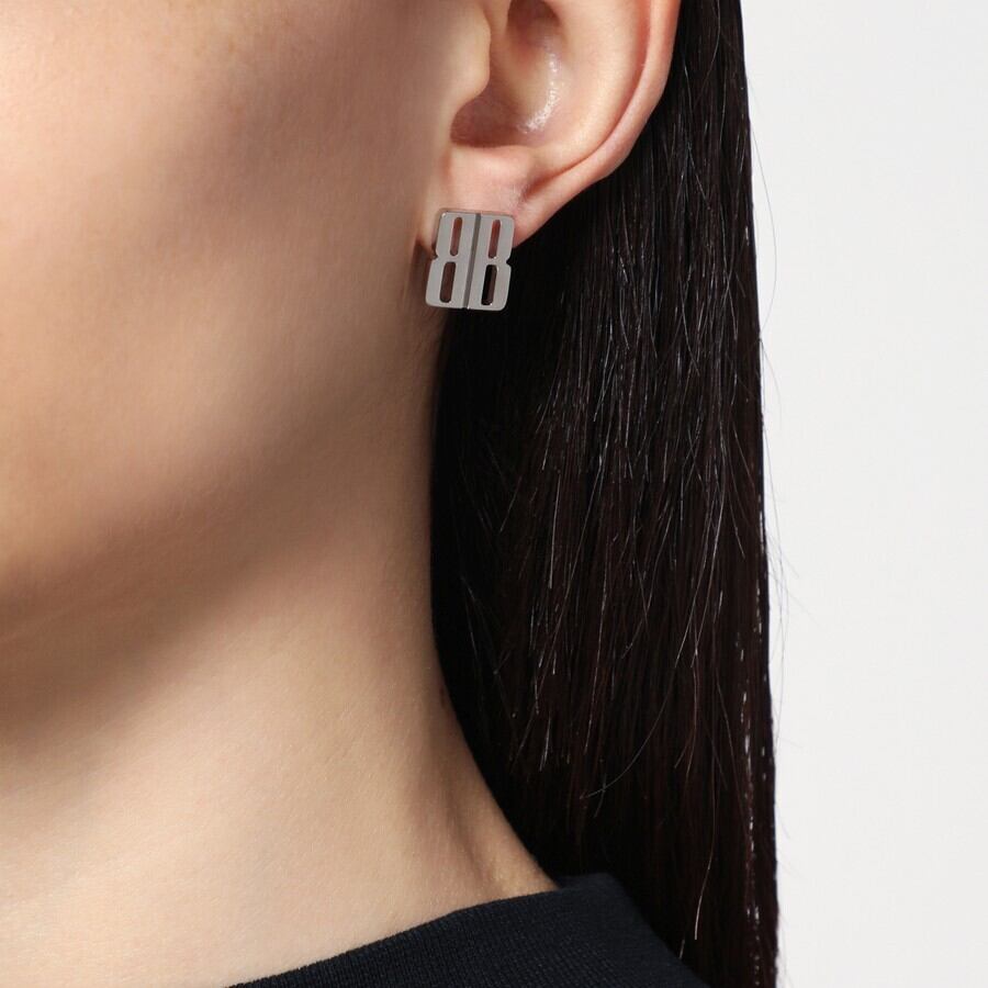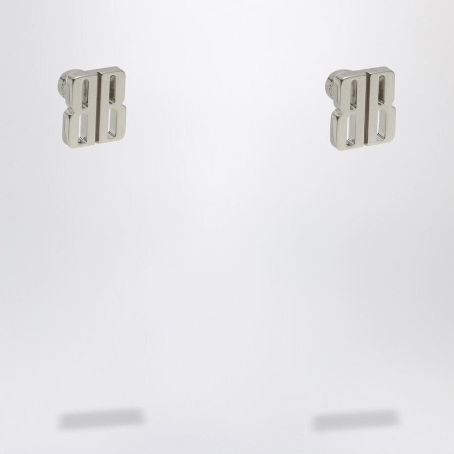 バレンシアガのシルバー真鍮スタッドイヤリング。BBナノロゴと、後ろに丸いイヤリングバックが付いた留め具が特徴です。
