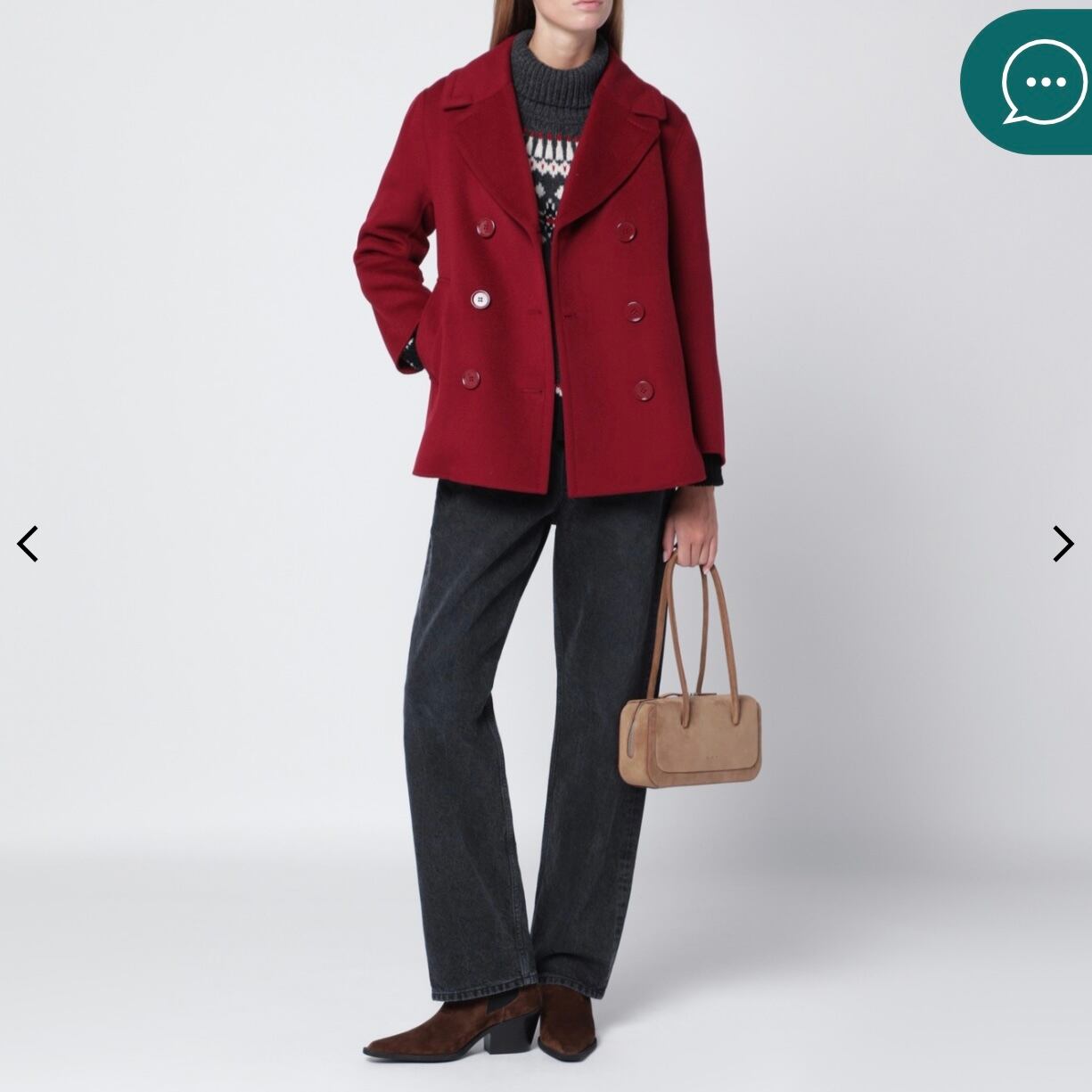 S Max Maraのショート丈ダブルブレストコート。バーガンディのバージン ウールを使用。わずかにフレアなライン、ワイドなラペルカラー、長めのラウンド スリーブ、ボタン留め、サイドポケットが特徴です。