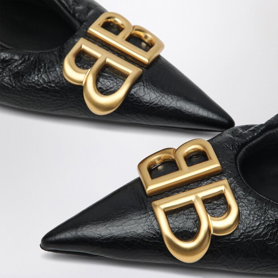 尖ったデザイン、背面の伸縮性のあるストラップ、アッパーのゴールドのモナコBBロゴ、レザーソールが特徴です。