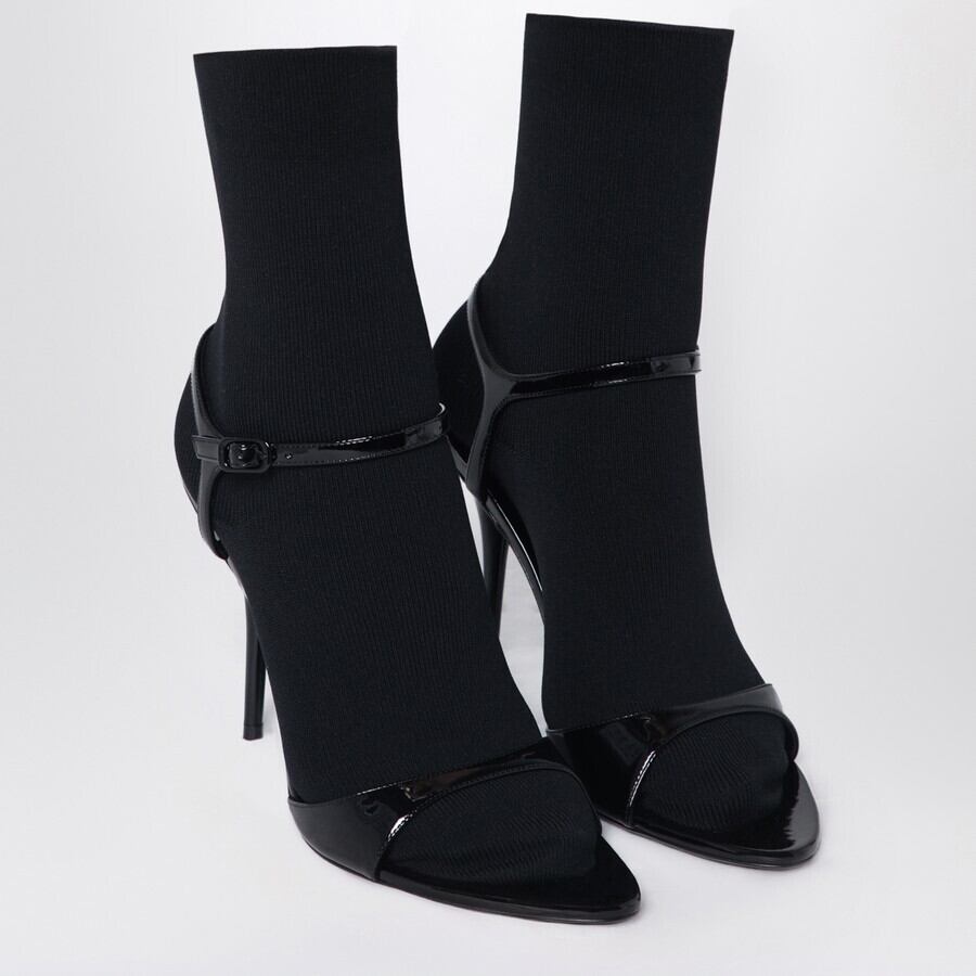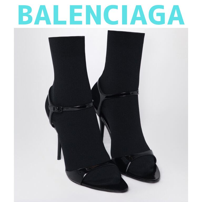 バレンシアガのパテントレザーブラックカーフスキンサンダル。調節可能な足首ストラップ留め、一体型のブラックニットソックス、背面にメタル BBロゴが付いた細めのハイヒール、オープントウ、レザーソールが特徴です。