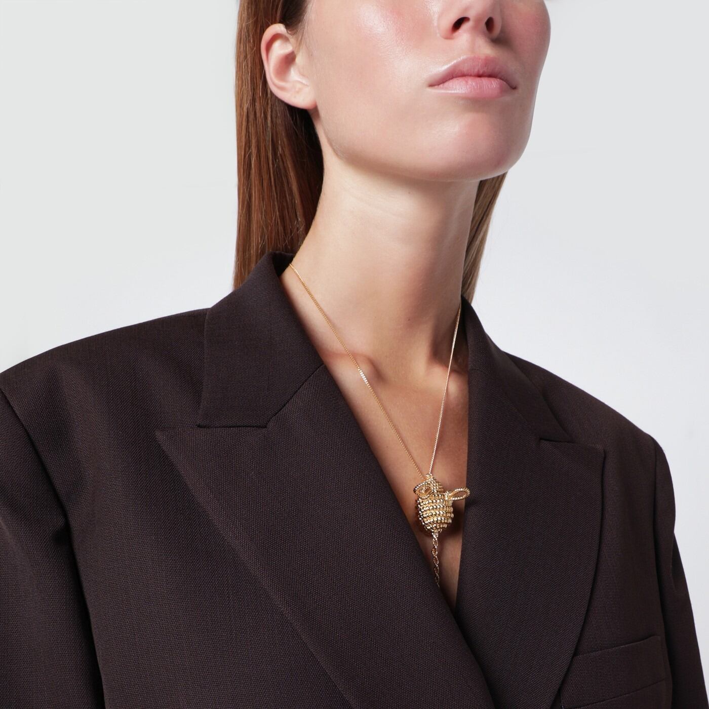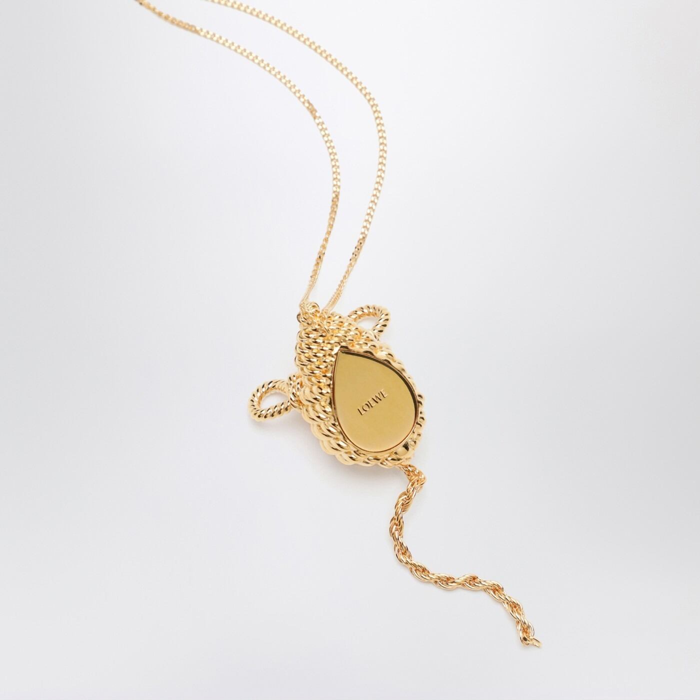 ロエベのゴールドブラスネックレス。ミッキーマウスのペンダント、フック留め、ロゴ刻印入り。