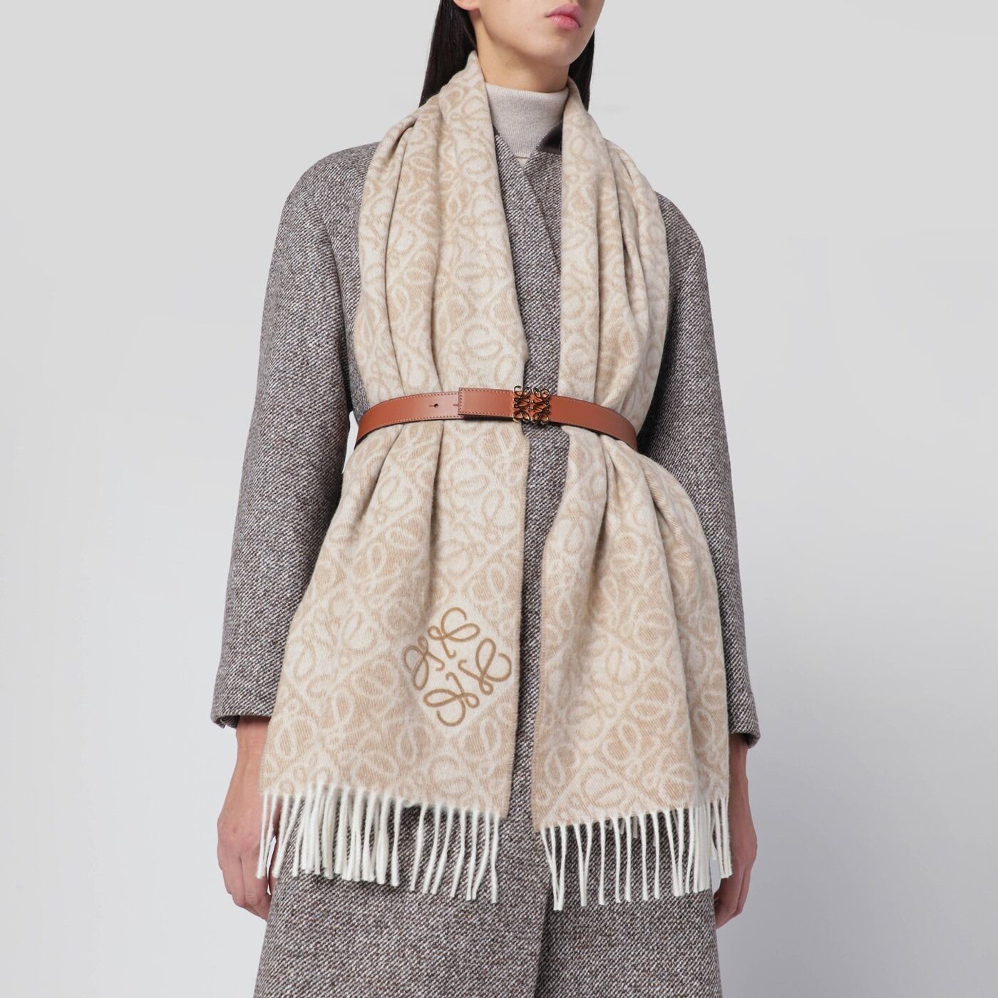 ロエベのベージュのウールとカシミアを使用したスカーフ。全体にアナグラムロゴ、フリンジの縁、そして縁にロゴパッチが施されています。