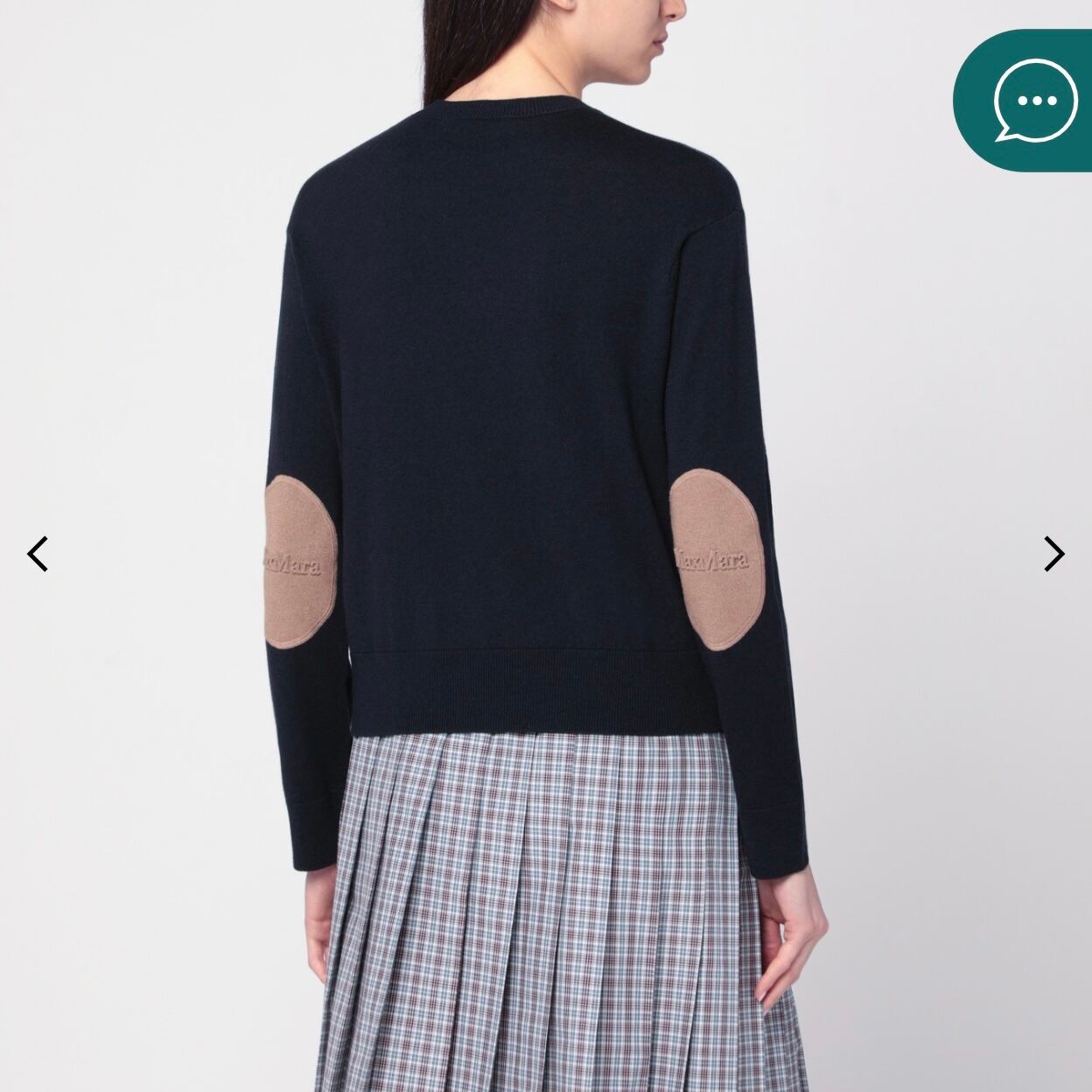 'S Max Maraのネイビーウール製クルーネックセーター。長袖で、キャメル カラーのパッチ、肘にエンボスロゴ、リブ編みのエッジが特徴です。