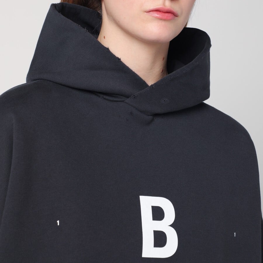 バレンシアガのブラックの色あせたコットンパーカー。長袖、フロントのカンガルーポケット、フロントにコントラストの効いたオプティカル モチーフのプリント、リブ編みのエッジ、オーバーサイズ フィットが特徴です。