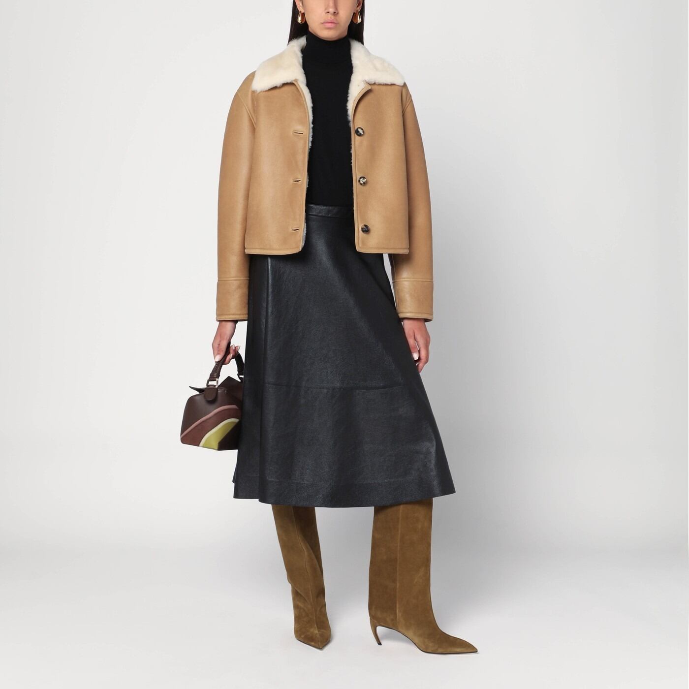 ロエベのショートコート。滑らかなベージュのキャメルメリノシアリングを使用。ワイドカラー、長袖、フロントボタン留め、ウェルトポケット2つ、背面にアナグラムロゴ入りのレザーパッチ、レギュラーフィットが特徴です。