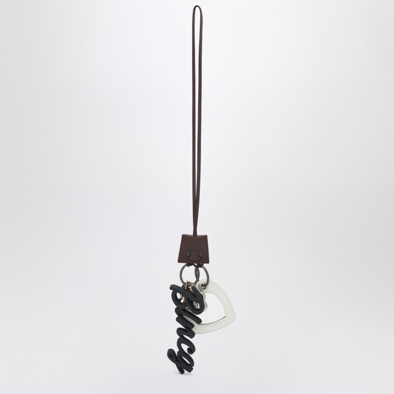 シリコンレザー、真鍮、アクリルを使用したバレンシアガのキーチェーン。バッグに付けるチャーム、チャーム付きのダブルスパイラルリング、リングに刻印されたロゴ、ホワイトハートミラーが特徴です。