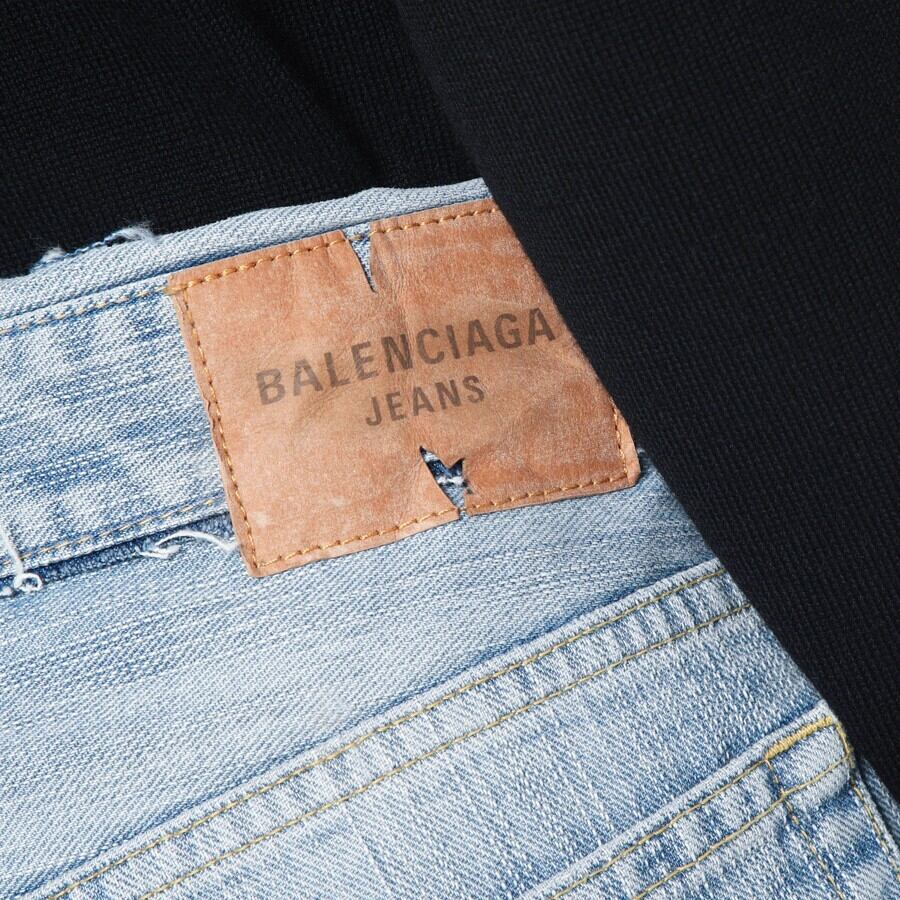 ライトブルーのコットンデニムを使用したバレンシアガジーンズ。色褪せ加工が施されており、ローウエストでローカットのディテールとベルトループ、フロントはジッパーとボタンで開閉、クラシックなポケットが5つ、背面には使い古したロゴパッチが付いています。
