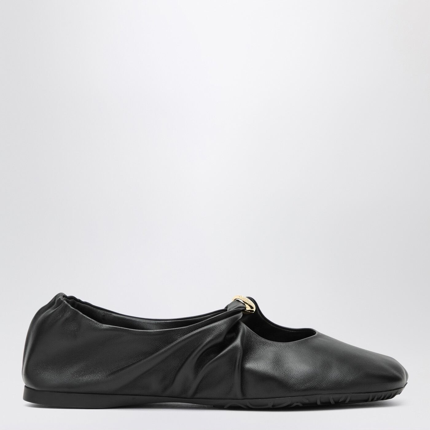 柔らかなブラックラムナッパを使用したロエベのバレリーナシューズ。アナグラムの刻印が施されたメタリックなディテール、花びら型のつま先、パッド入りレザーのインソール、そしてアナグラムのエンボス加工が施されたラバーソールが特徴です。