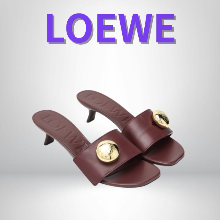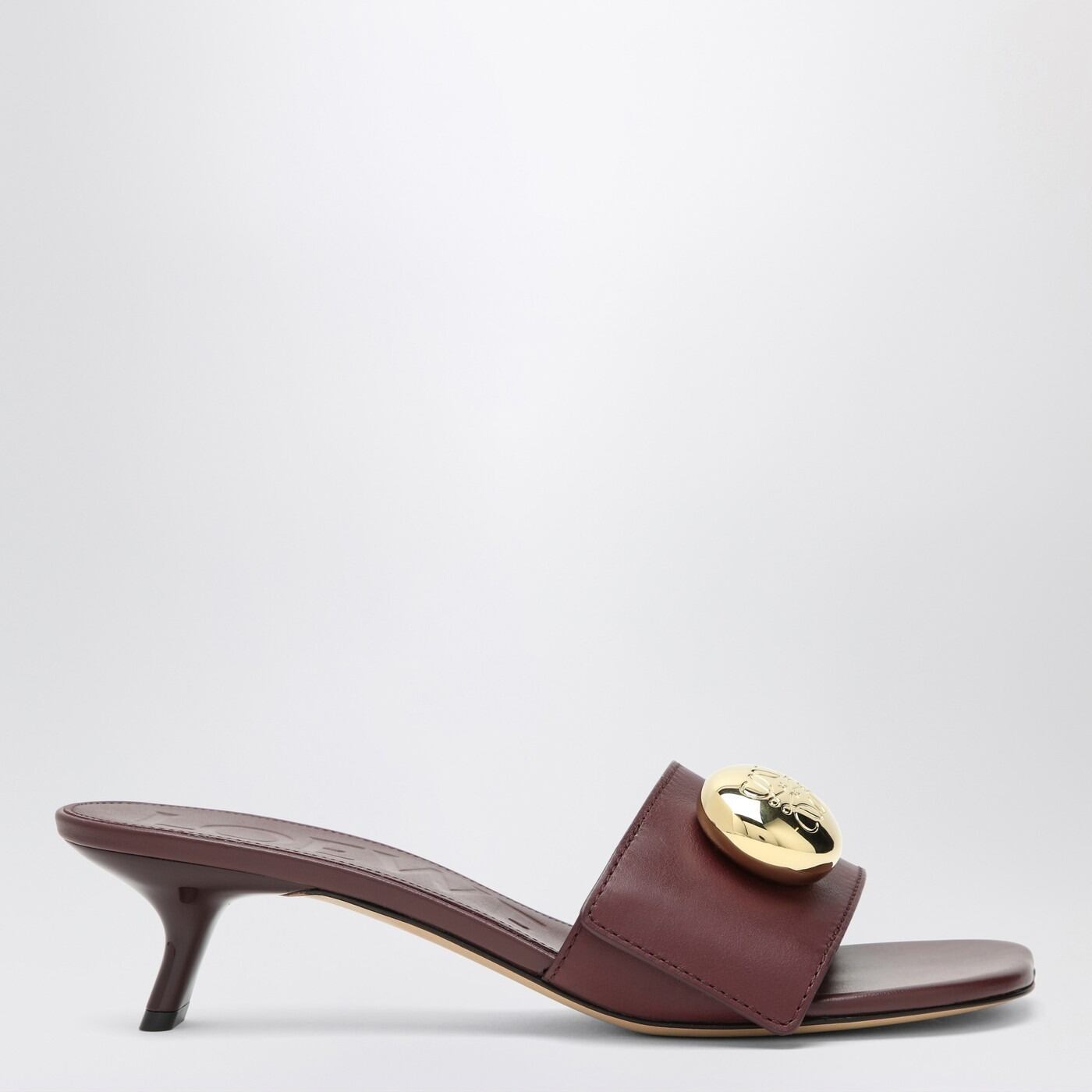 ボルドーのカーフレザーを使用したロエベのスライドサンダル。アッパーにはゴールド仕上げのメタル製アナグラム・ペブル・メダリオン、インソールにはエンボスロゴ、斜めヒール、レザーソールが特徴です。