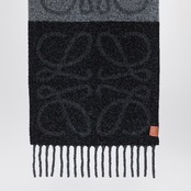 ロエベのダークグレーとブラックのアルパカ&ウールスカーフ。全体にアナグラム柄、ダブルフェイスデザイン、フリンジエッジ、ロゴ入りレザータブが特徴です。