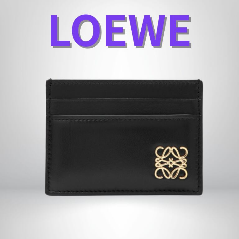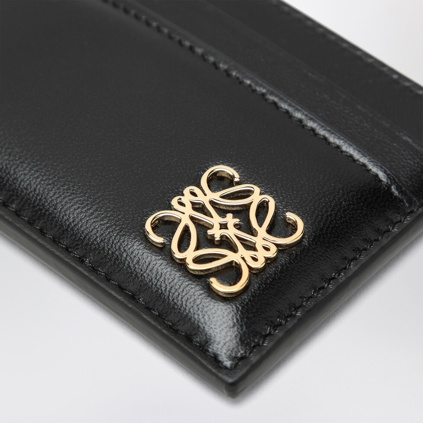 ロエベの滑らかなブラックカーフスキン製カードケース。4つのカードスロット、中央のポケット、そしてフロントにゴールドのアナグラムモチーフが特徴です。
