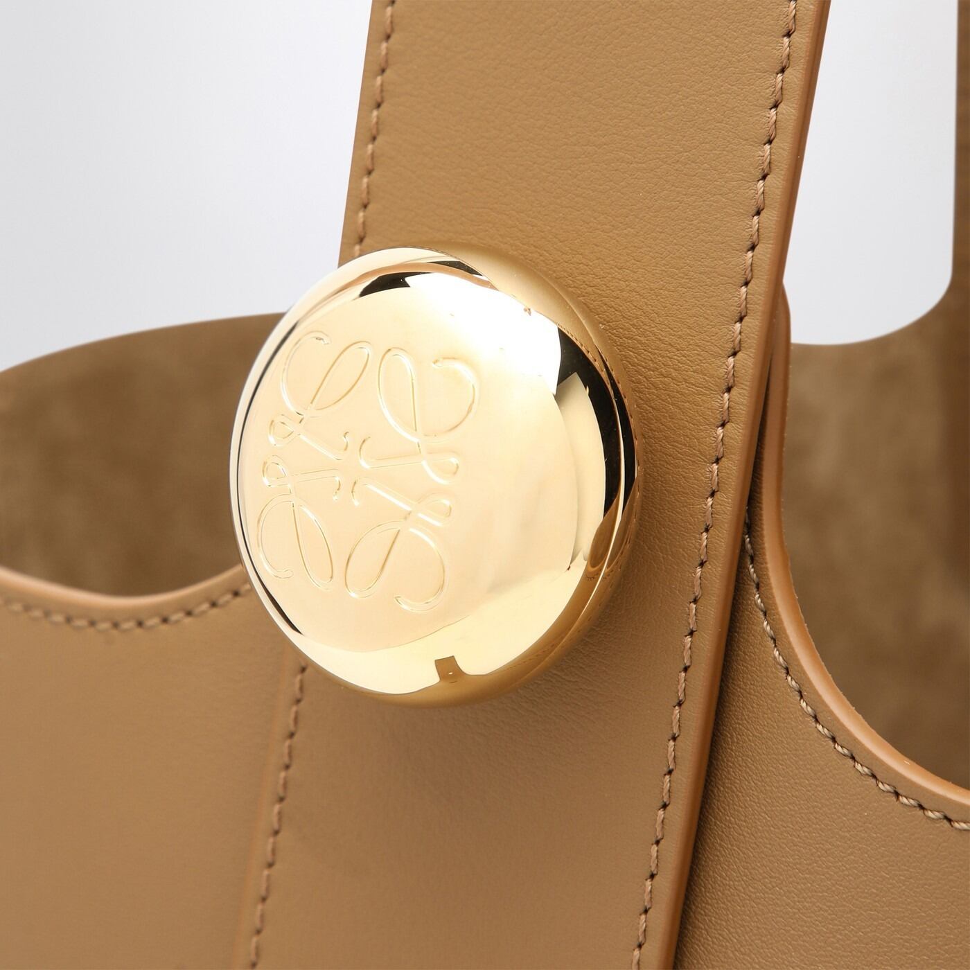 ロエベのブラウンカーフスキンレザー製ミディアムバケットバッグ。マグネット開閉式、ゴールドトーンボタンで調節可能なショルダーストラップ(アナグラムロゴが刻印されています)、内側にフラットポケット、ゴールドトーンのメタル金具が特徴です。