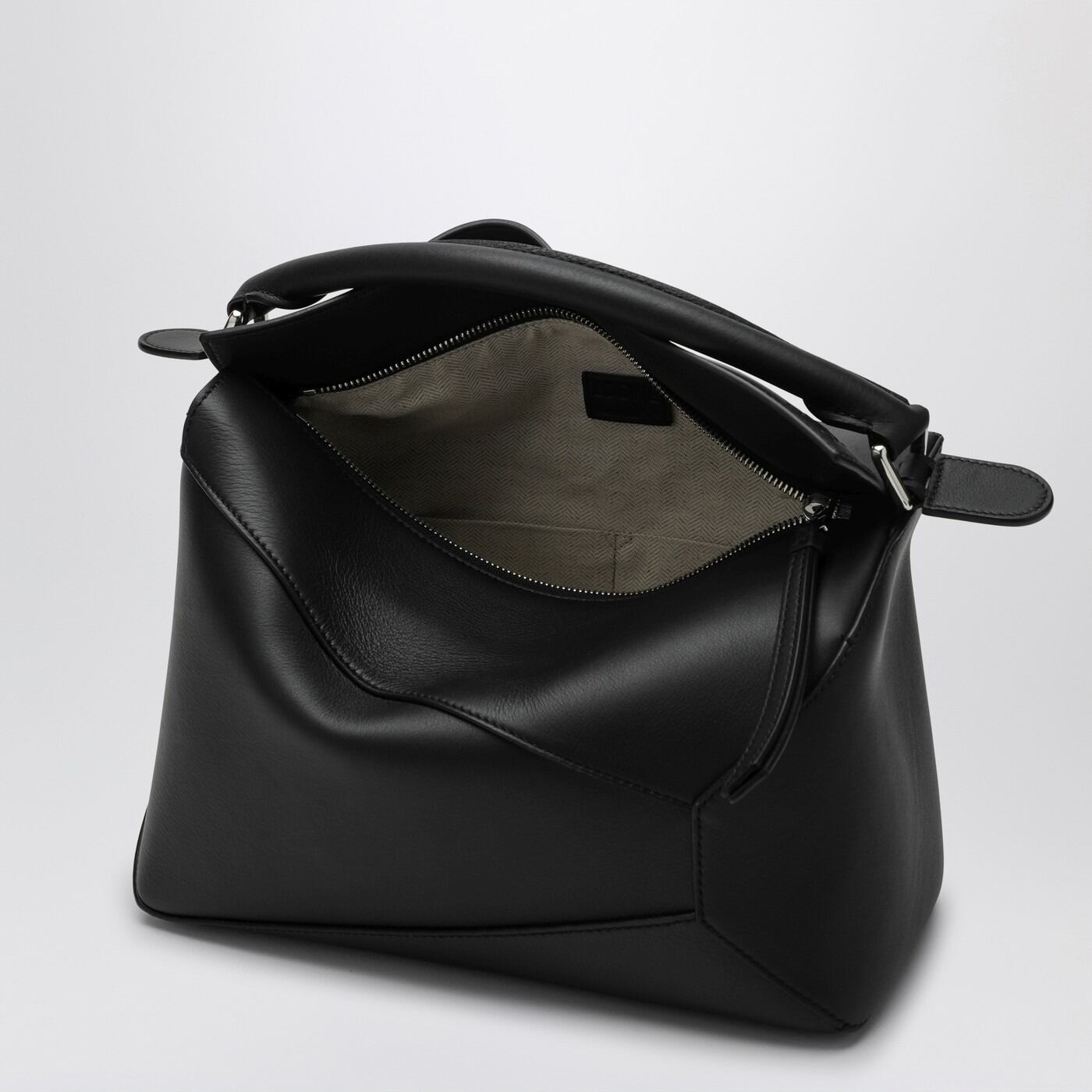 ロエベのブラックカーフスキン製ミディアムサイズバッグ。調節・取り外し可能なストラップ、ジップ開閉、外側にジップポケット、トーンオントーンのエンボス加工されたアナグラムロゴ、キャンバスライニング、内側にフラットポケット2つを備えています。