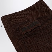 リブ編みのデザインとサイドのエンボスロゴが特徴の、ブラウンココアの シルク混紡素材を使用したミュウミュウのソックス。