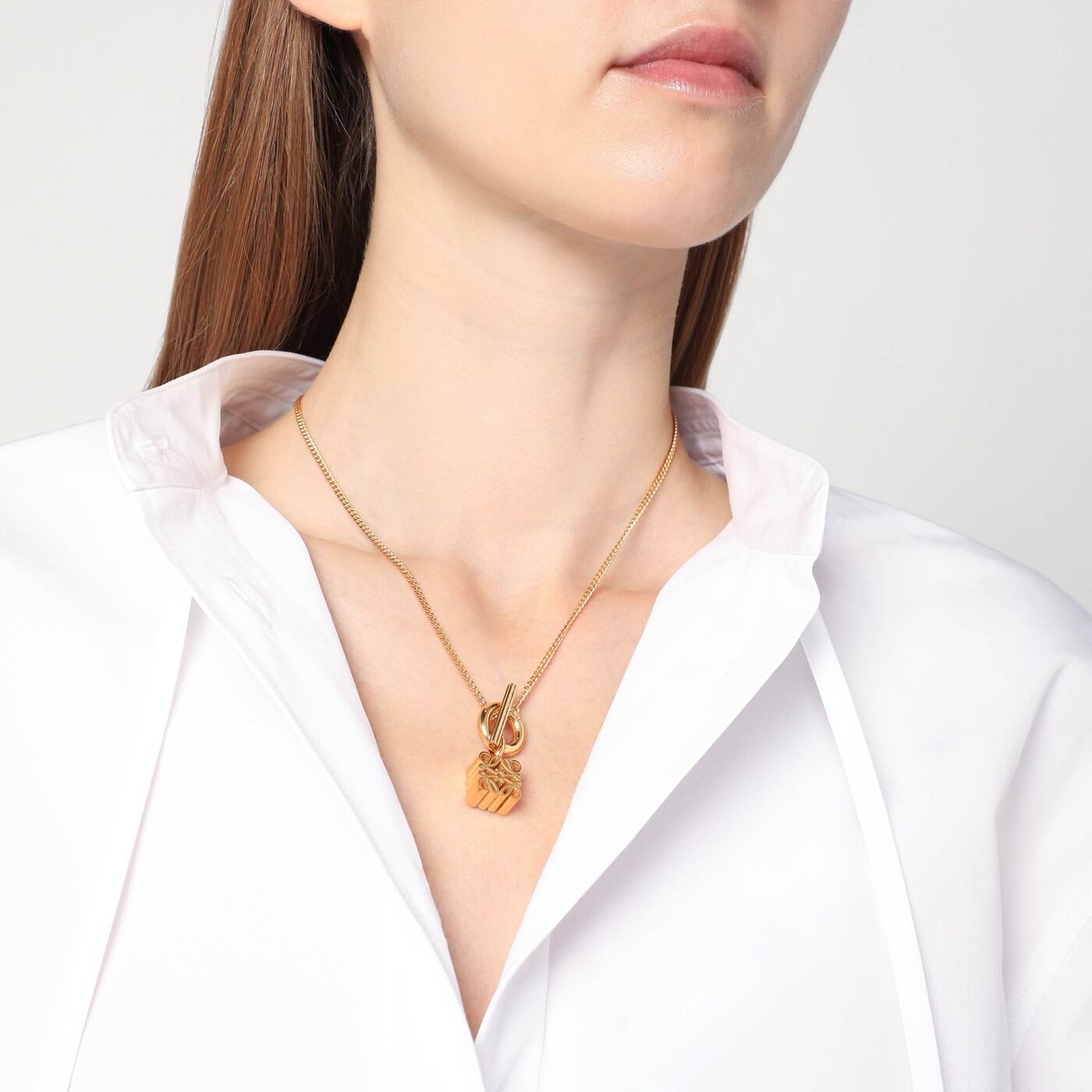 ゴールド仕上げのロエベ スターリングシルバー ネックレスは、アナグラムのロゴがあしらわれたキュービックなペンダントと、刻印されたレタリングのロゴとバーがあしらわれた円形のクラスプが特徴です。