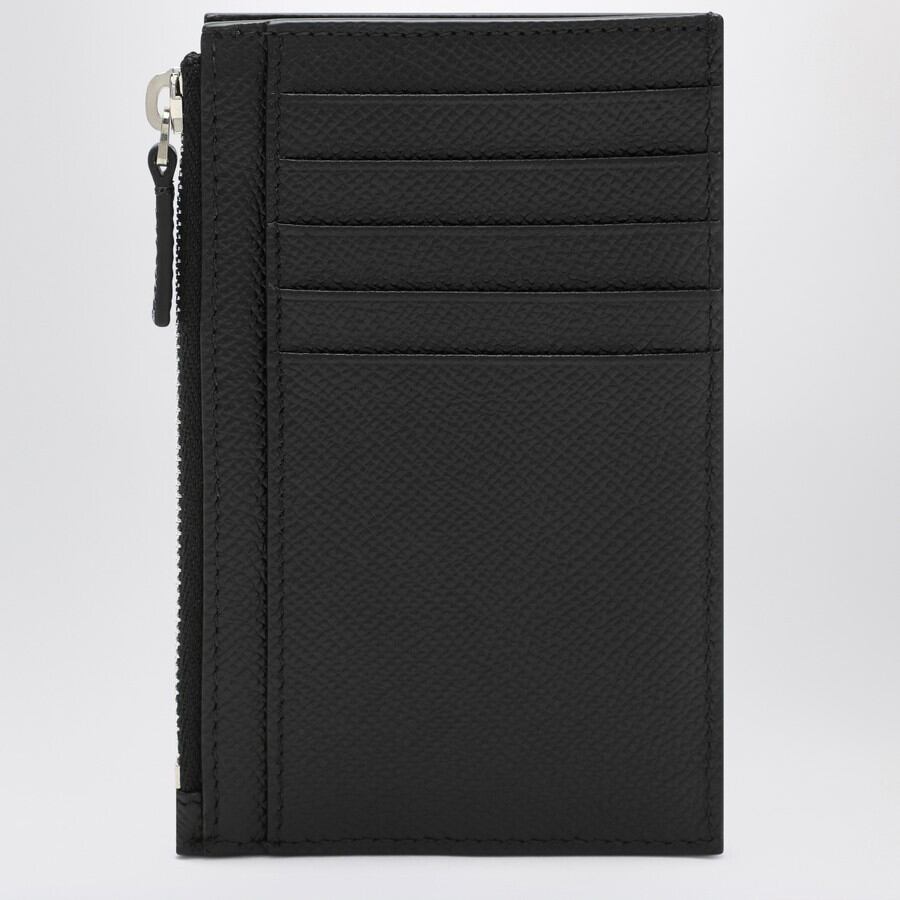 バレンシアガのブラックレザーカードホルダー。前面にエンボス加工のロゴ、ジッパー付きのコインコンパートメント、ジッパー付きの財布、領収書用のコンパートメント、5つのカードスロットを備えています。