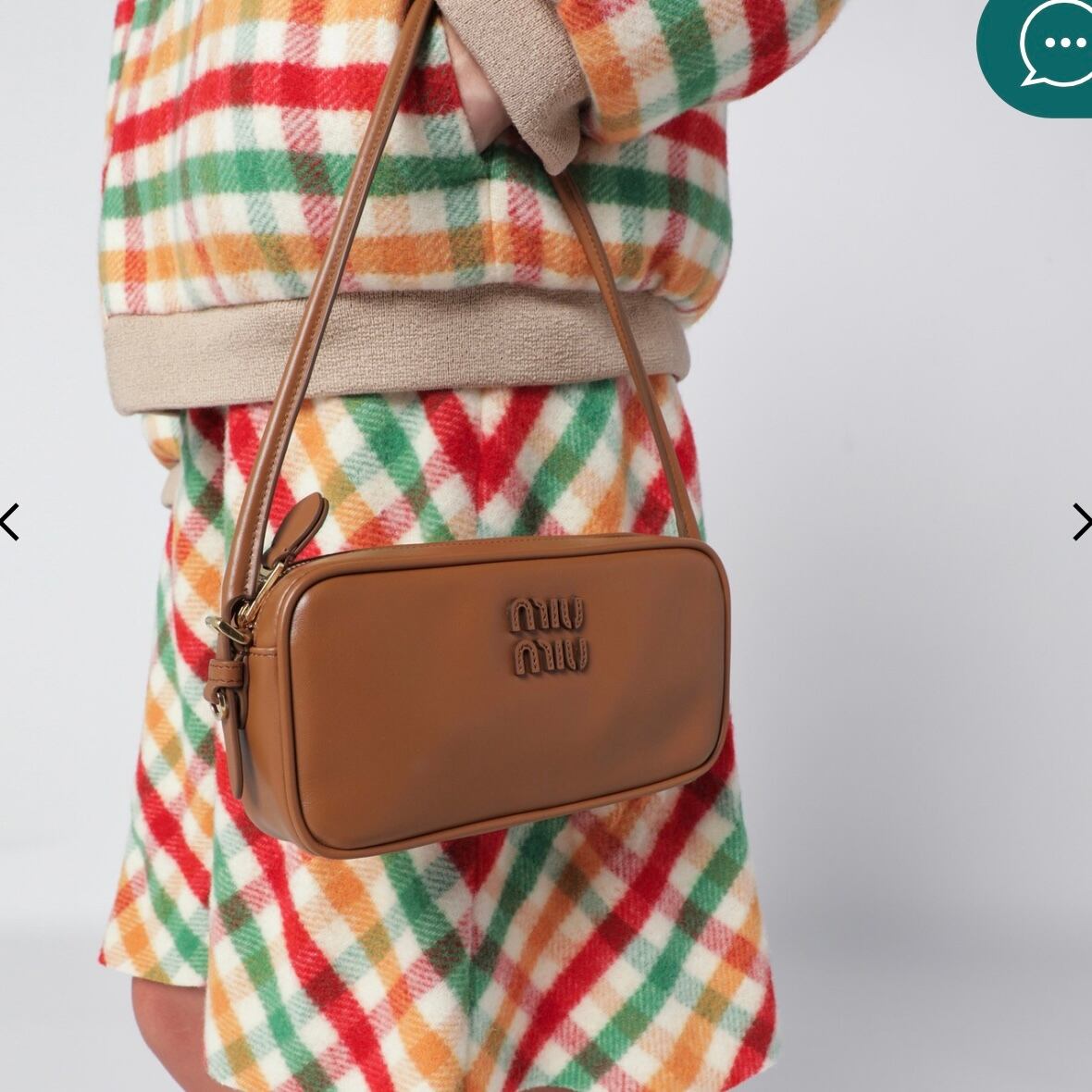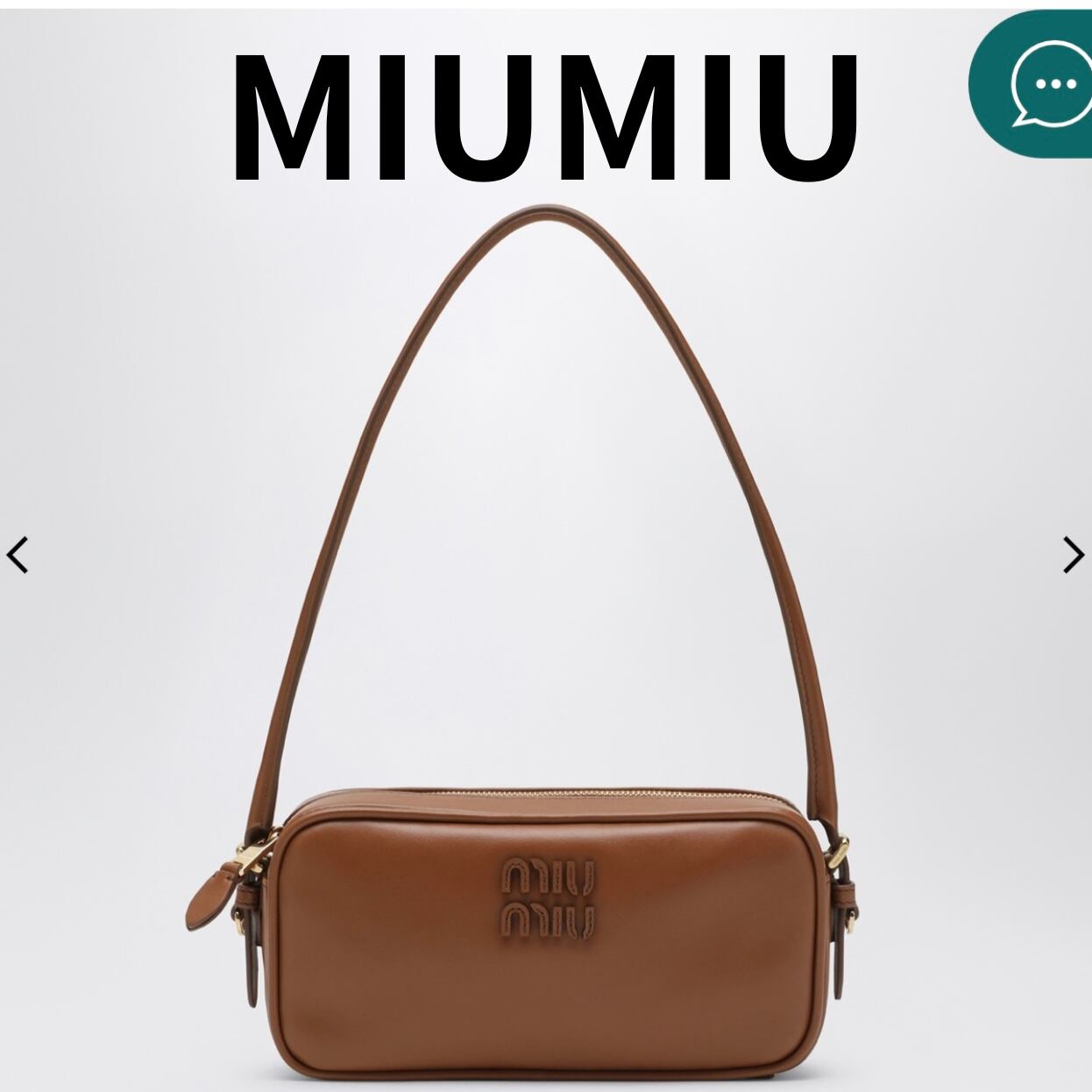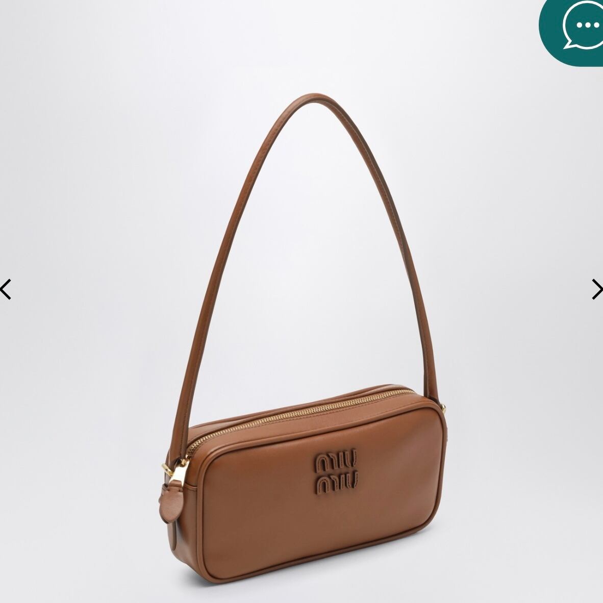 軽くパッド入りのコニャックカラーレザーを使用したミュウミュウのバッグ。調節 可能・取り外し可能なショルダーストラップ、ジッパー開閉、フラットな内ポケット1 つ、フロントにエンボスロゴ、ゴールドトーンの金具が特徴です。