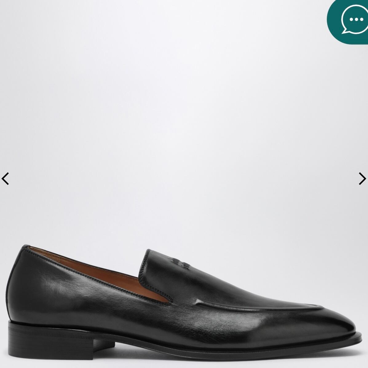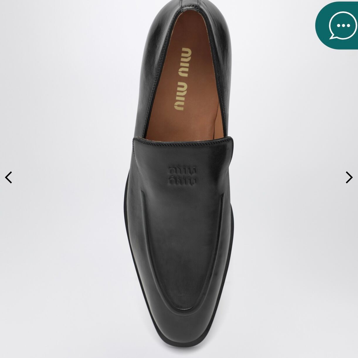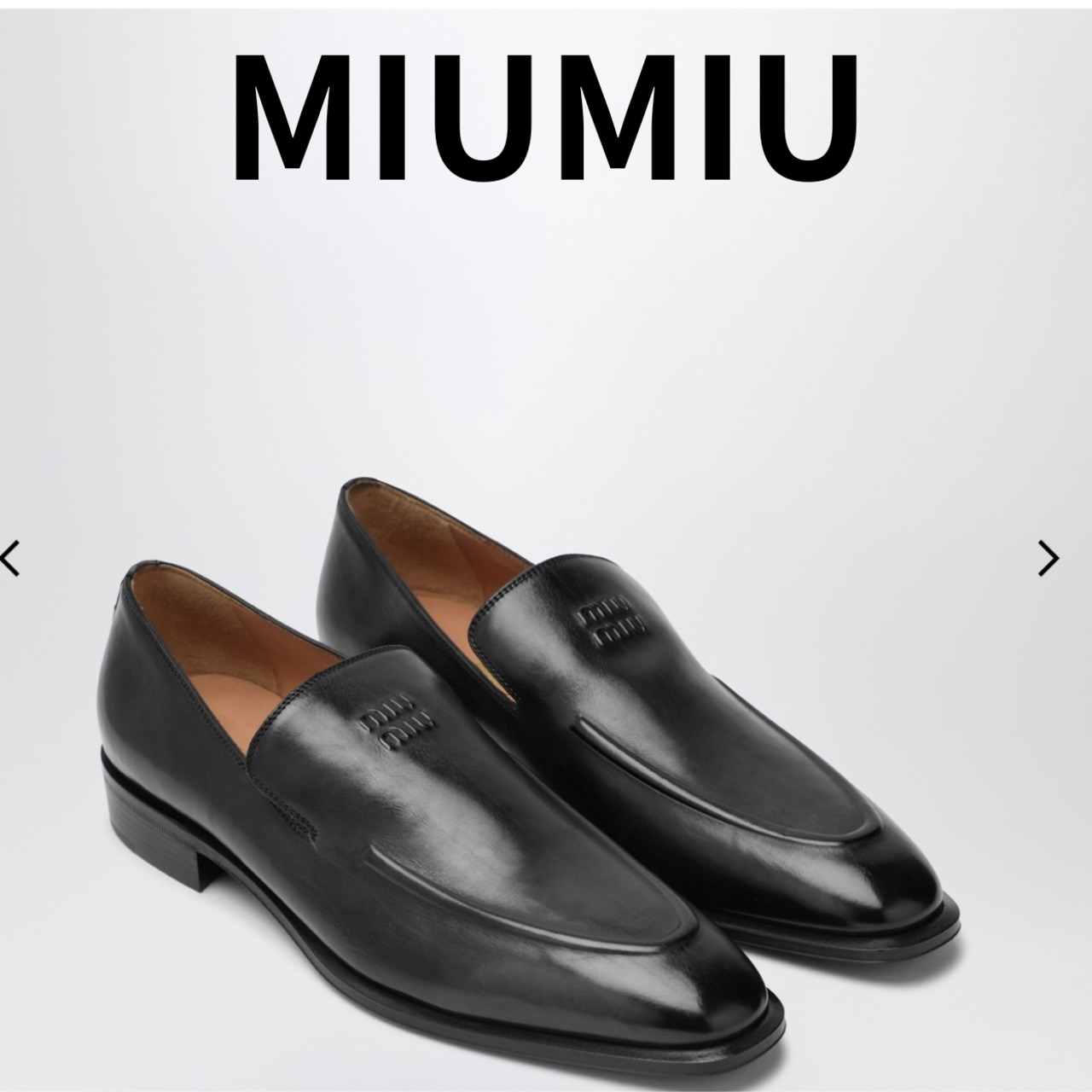 ミュウミュウのブラックカーフスキンレザーローファー。細長いフォルム、 フロントにエンボス加工のロゴ、レザーとラバーソールが特徴です。