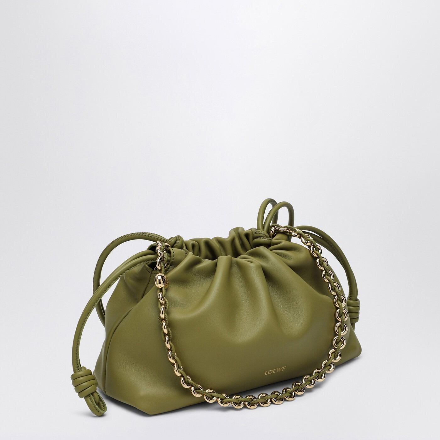 サイドに結び目が付いたシャーリングデザイン、調節可能で取り外し可能なショルダーストラップ、ロゴのディテールが施された取り外し可能なゴールドチェーン、マグネットクロージャー、フロントのエンボス加工レタリングが特徴のLoeweのライトモスカラーのソフトラムスキンミディアムバッグ。