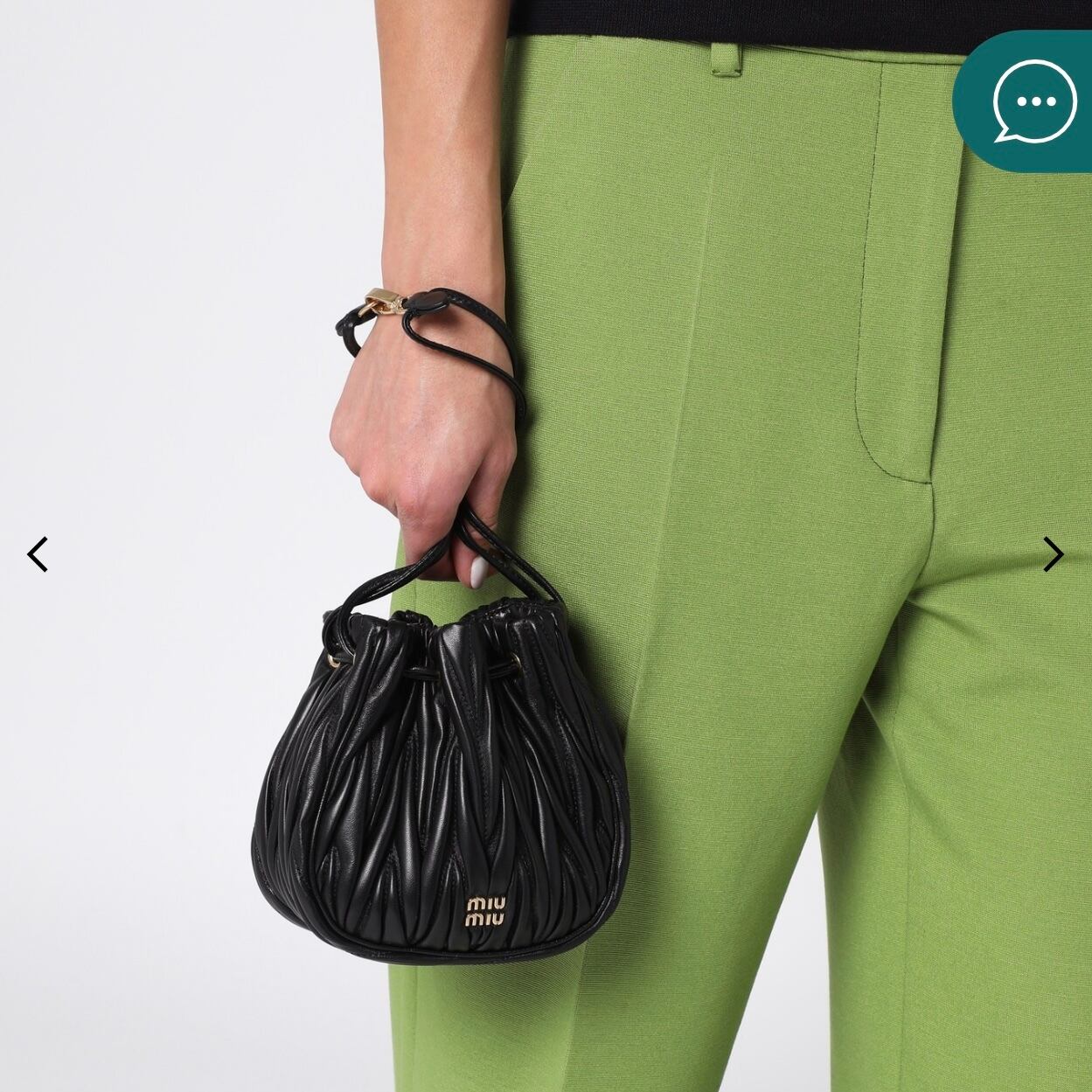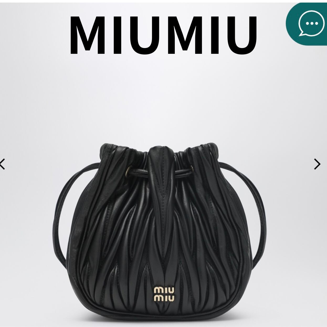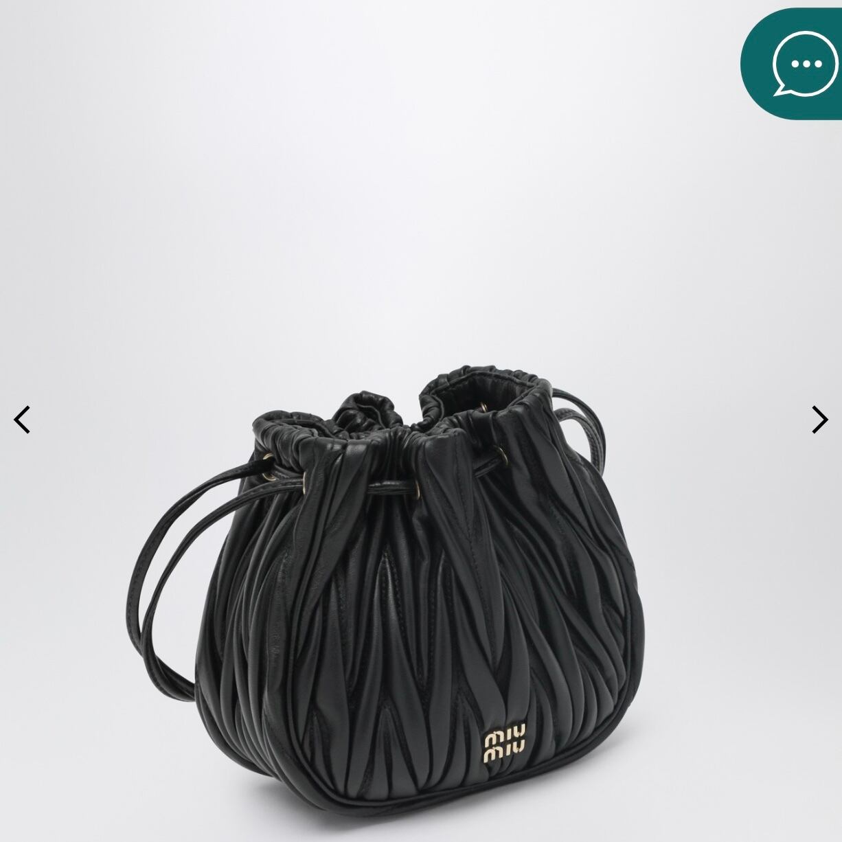 マトラッセ細工を施したブラックレザーのミュウミュウポーチ。 ドローストリング開閉、ゴールドメタルの金具、フロントのメタルロゴ レタリング、コットンサテンの内側が特徴です。