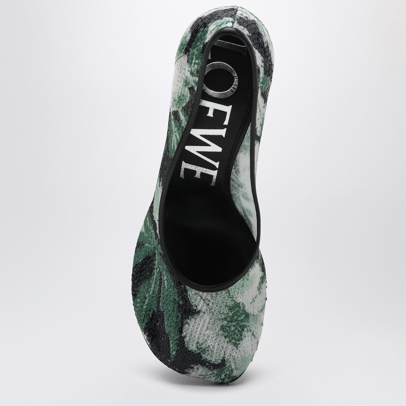 スパンコールで覆われたネットのロエベのデコルテは、花柄、花びらのつま先、ラッカー仕上げのトイヒール、ロゴレタリングのレザーソールが特徴です。