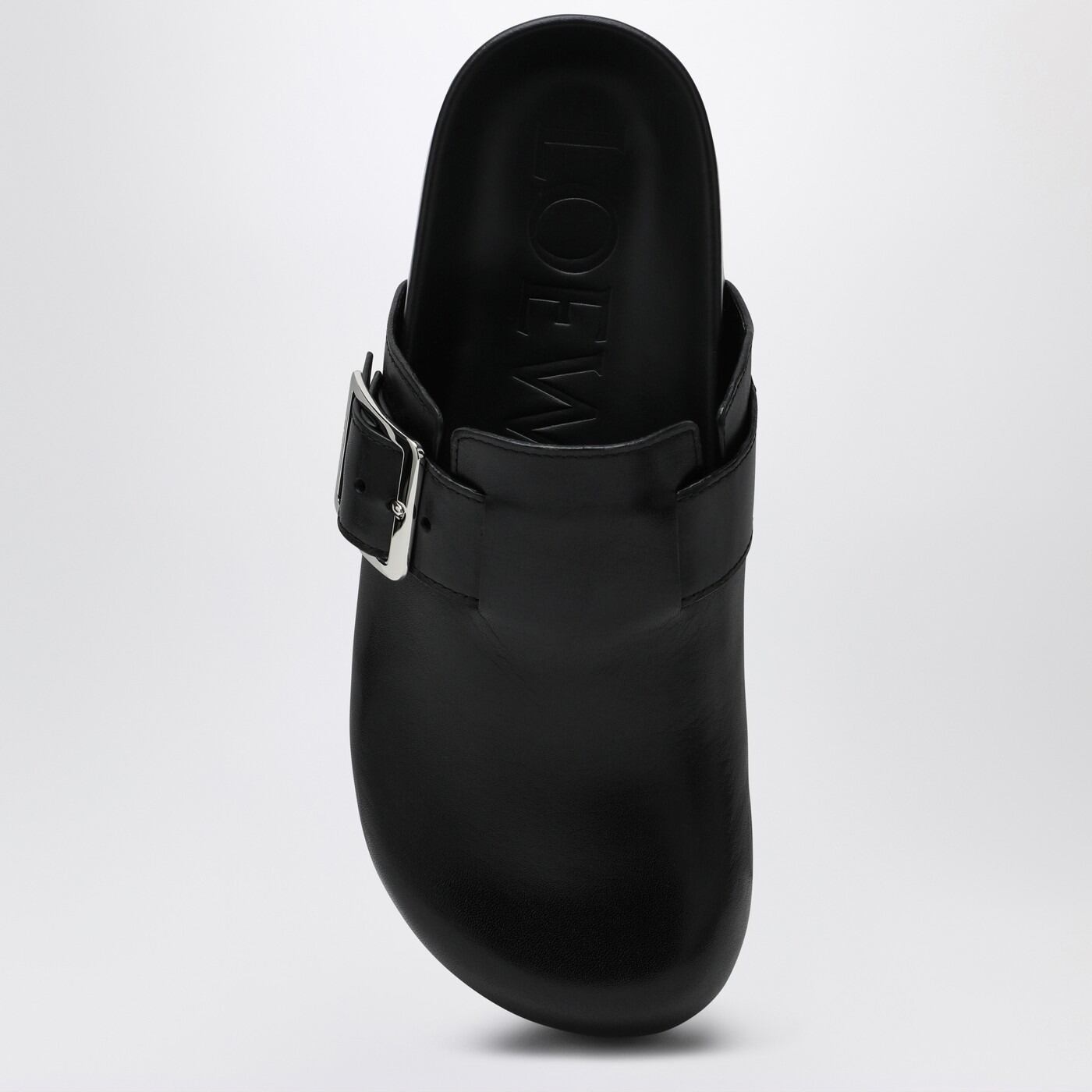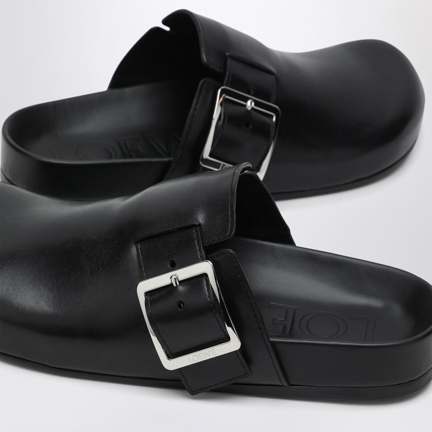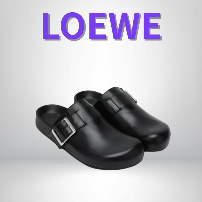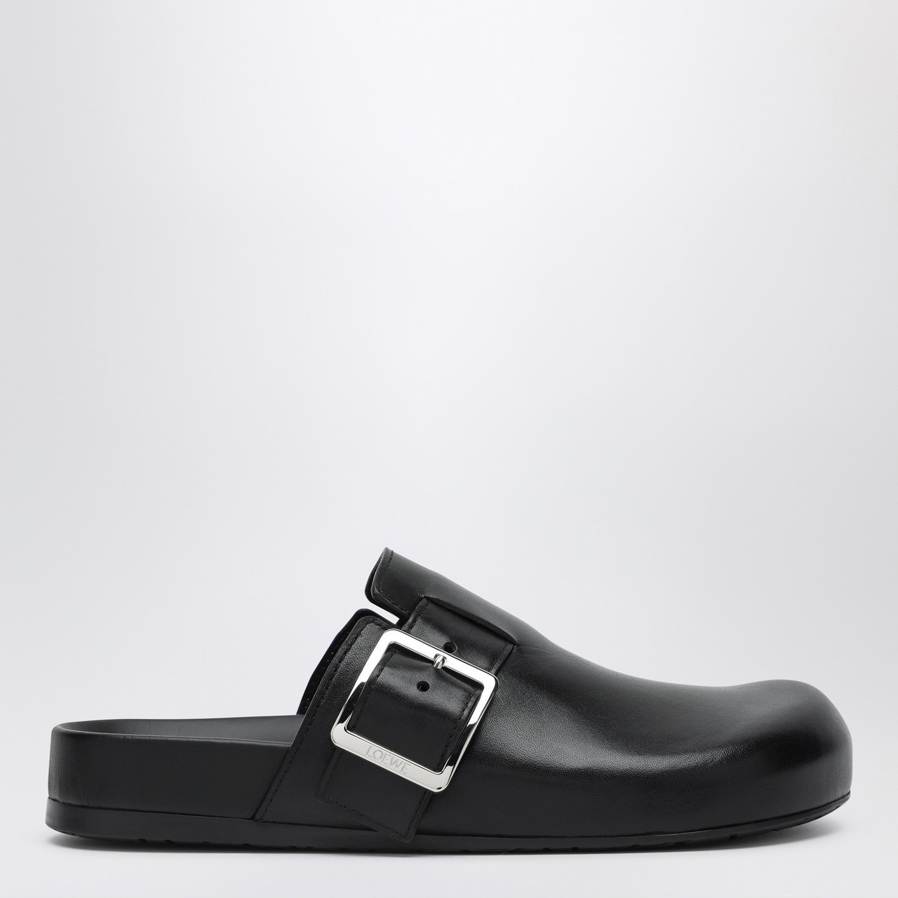 エンボスロゴ入りバックル、シェイプインソール、エンボス加工アナグラムパターン入りラバーソールが特徴のロエベのブラックカーフスキン下駄。