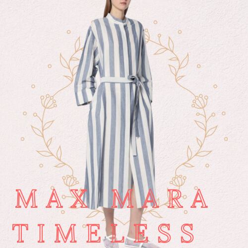 マックスマーラのミディ丈シャツドレス。ラミーとコットン素材にライトブルーと ホワイトのストライプ柄。フロントの隠しボタン留め、袖口はボタン留め、 ウエストにタイベルト、両サイドにウェルトポケット、マンダリン カラー、背面に小さなロゴパッチ。