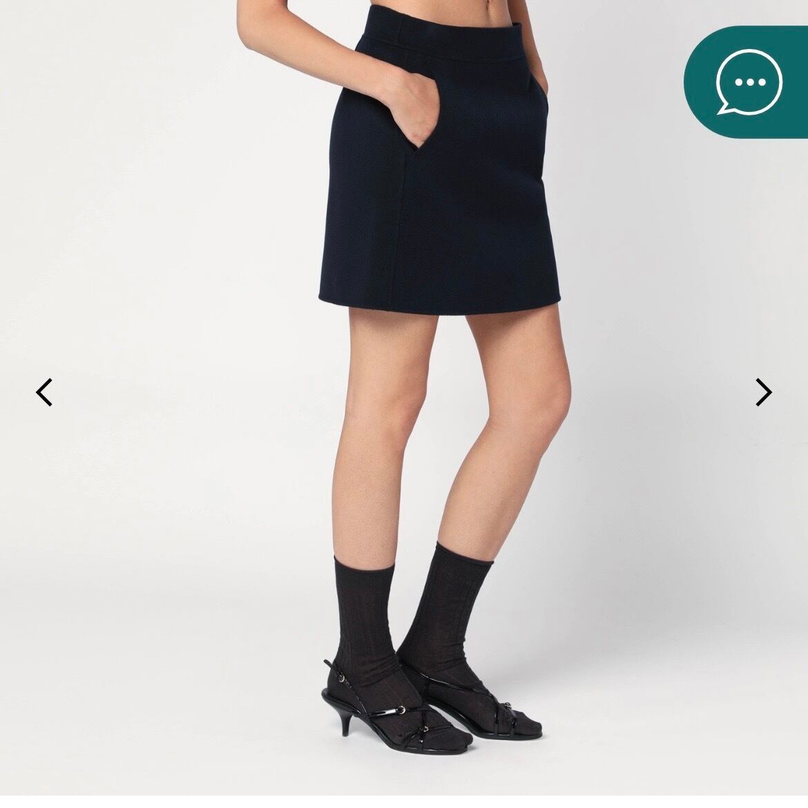 S Max Maraのミッドナイトブルーのバージンウール製ミニスカート。背面の ジッパー開閉と両サイドのウェルトポケットが特徴です。