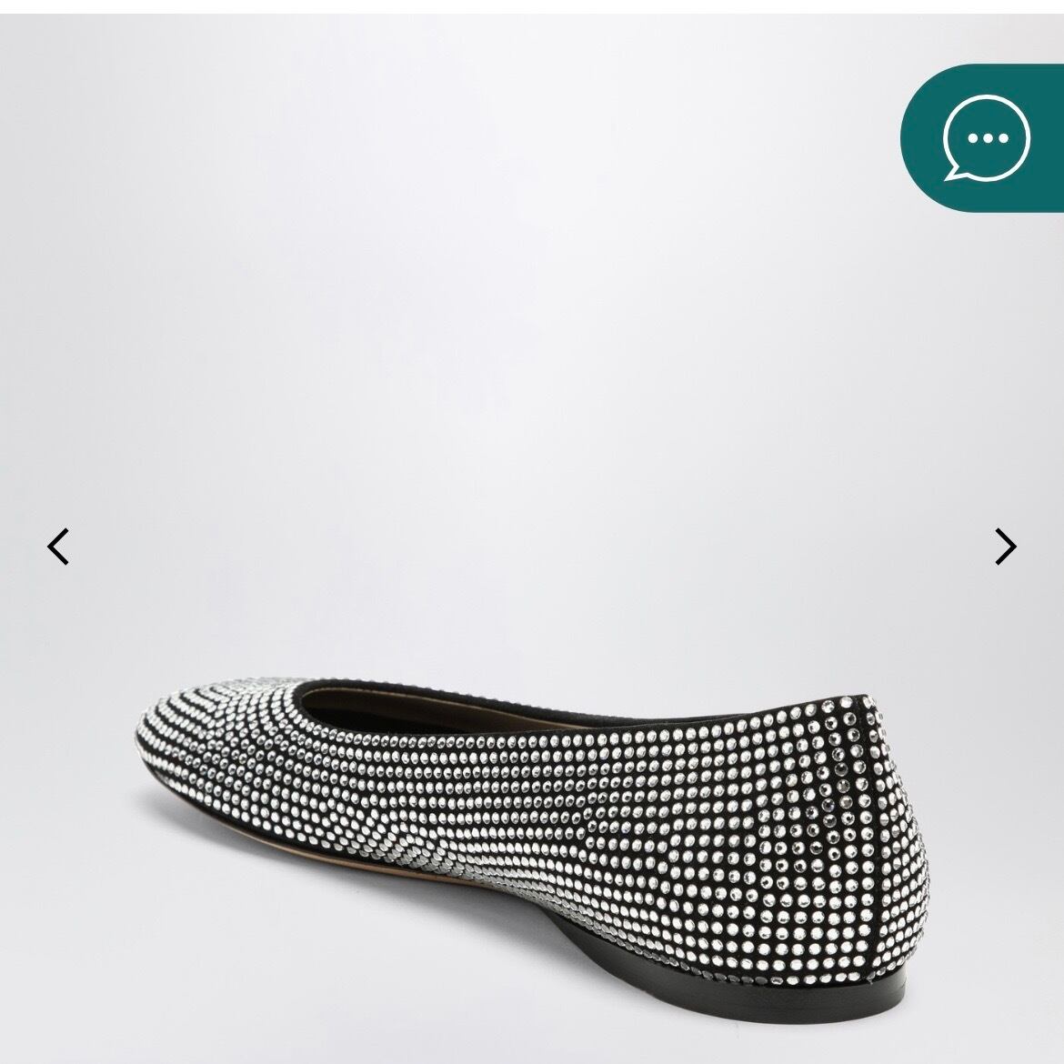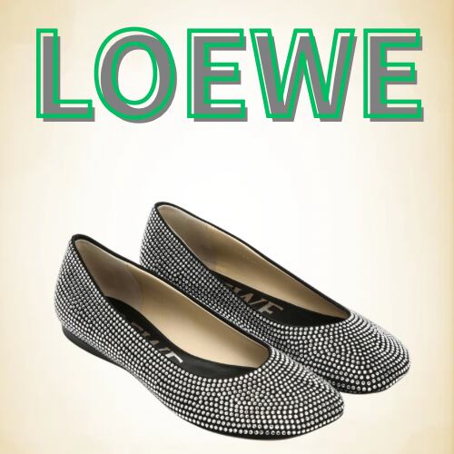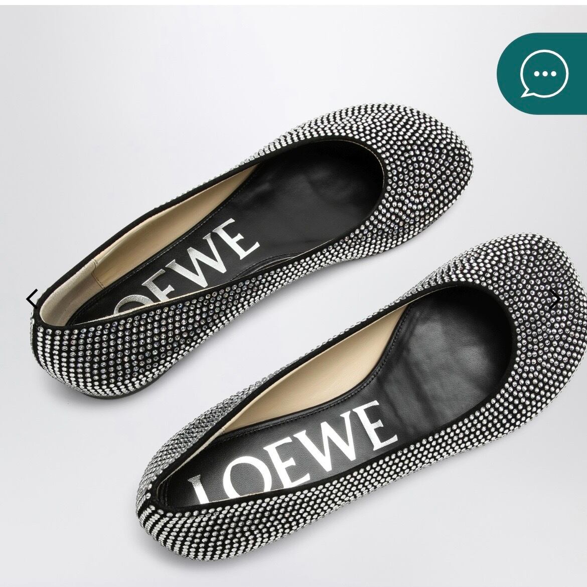 ロエベのブラックレザー製バレリーナ。全面にラインストーン、花びら型の つま先、レザーソールが特徴です。