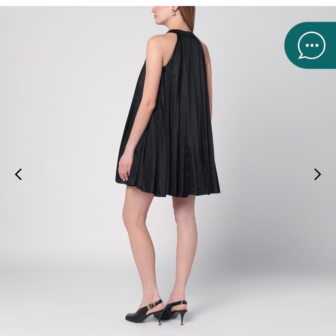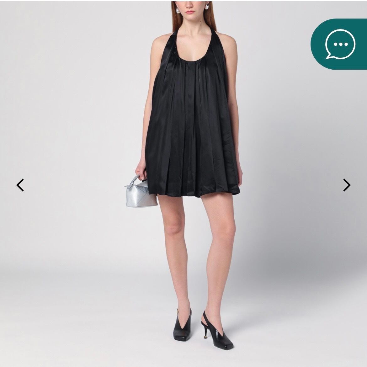 ロエベのブラックビスコースサテンを使用したノースリーブミニドレス。二重 構造のトラペーズデザイン、深いネックライン、両サイドのウェルトポケット、 レギュラーフィットが特徴です。