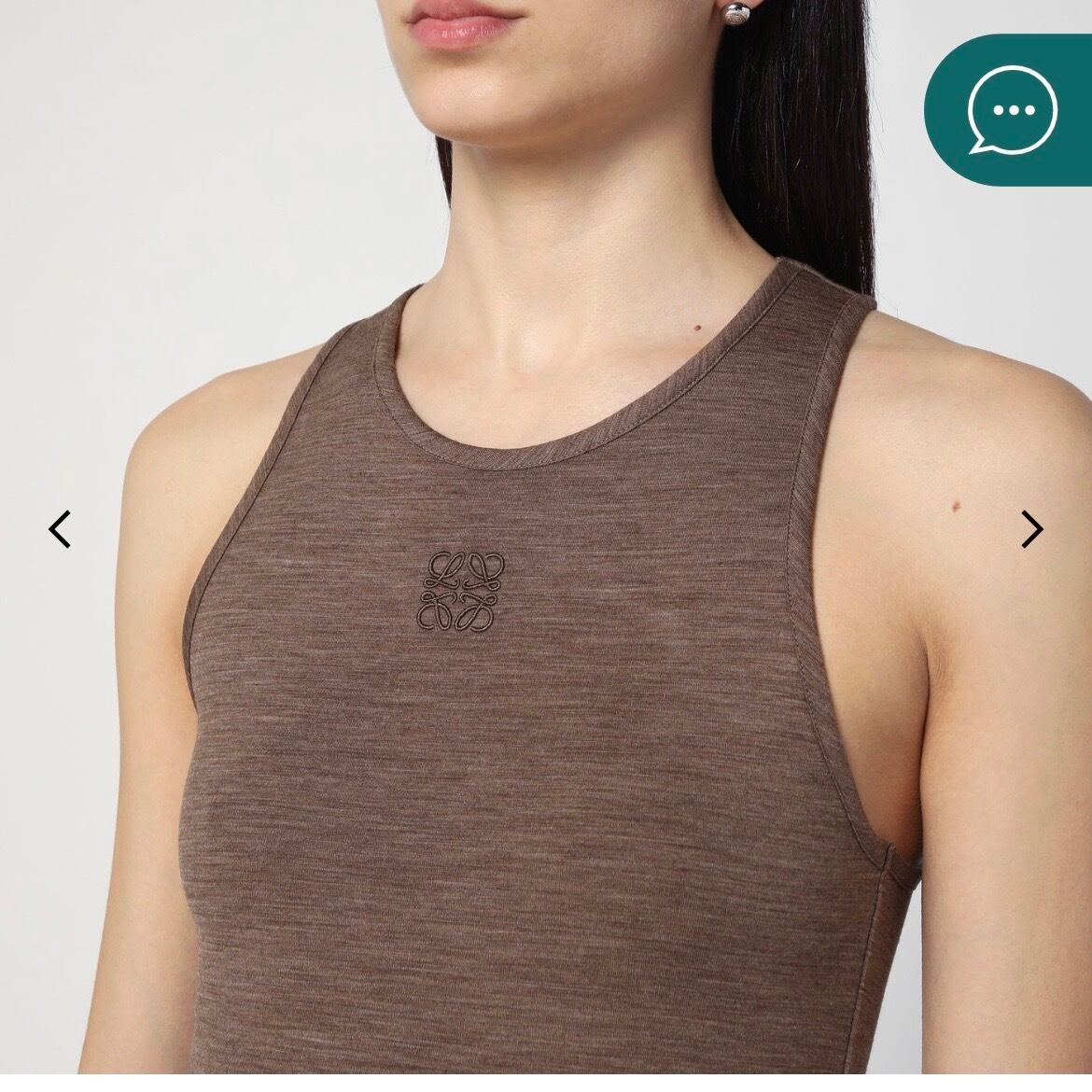 ロエベのチョコレートウール製ノースリーブクルーネックドレス。背面にクロス ディテール、サイドスリット、フロントにトーンオントーンのアナグラムロゴ 刺繍が施されています。