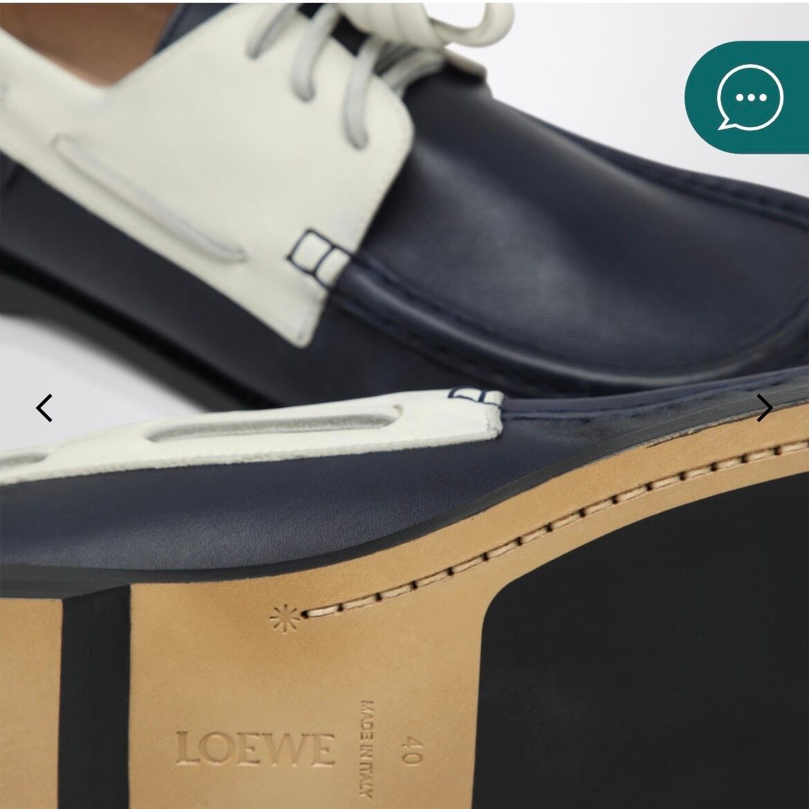 ネイビーブルーとホワイトのカーフスキンを使用したロエベのボートシューズ。丸み を帯びた花びら型のつま先、スクエア型のレザーレース、サイドに小さなロゴラベル、クッション 性のあるフレキシブルなインソール、レザーソールが特徴です。