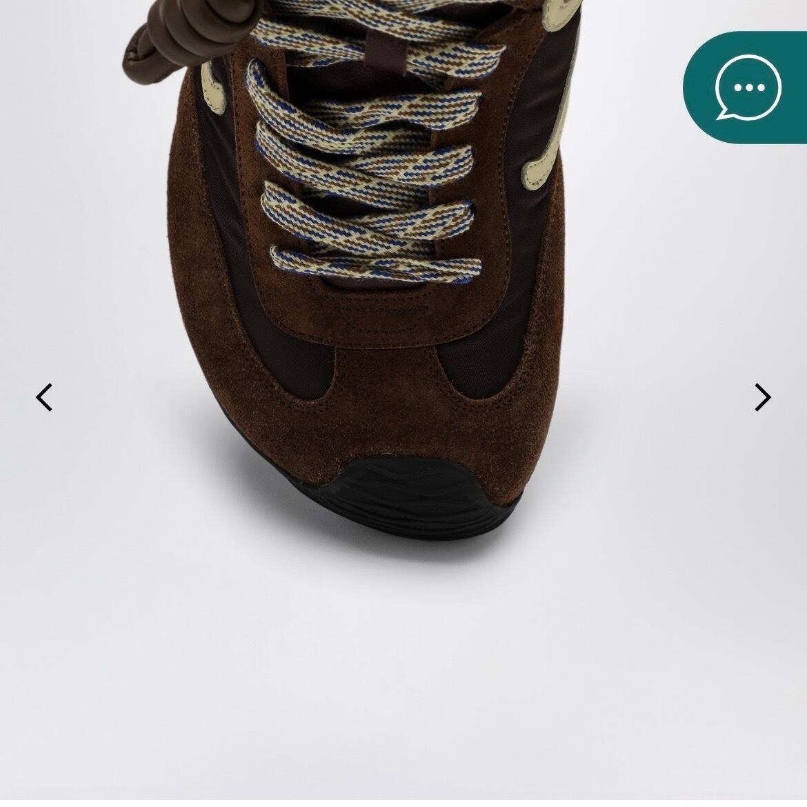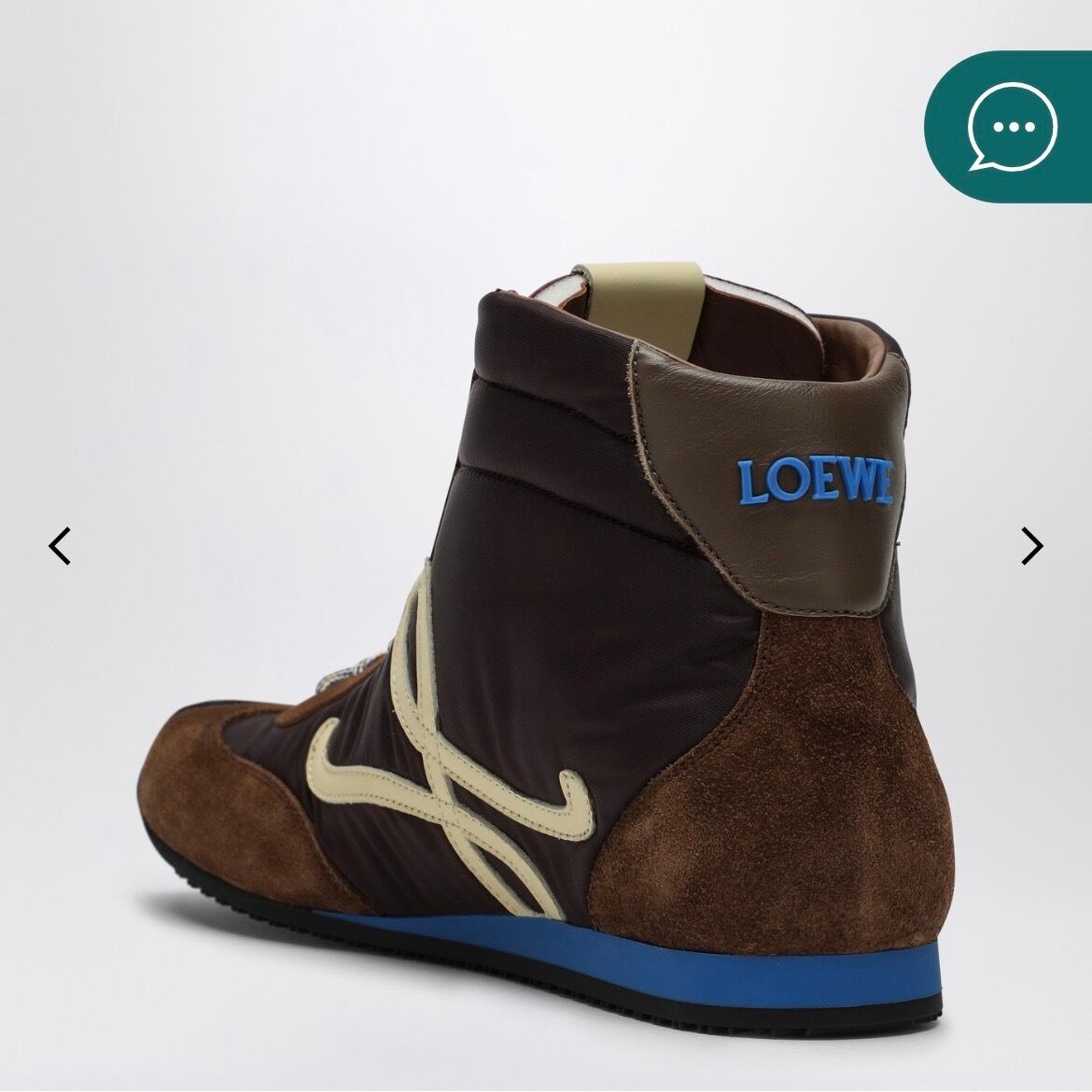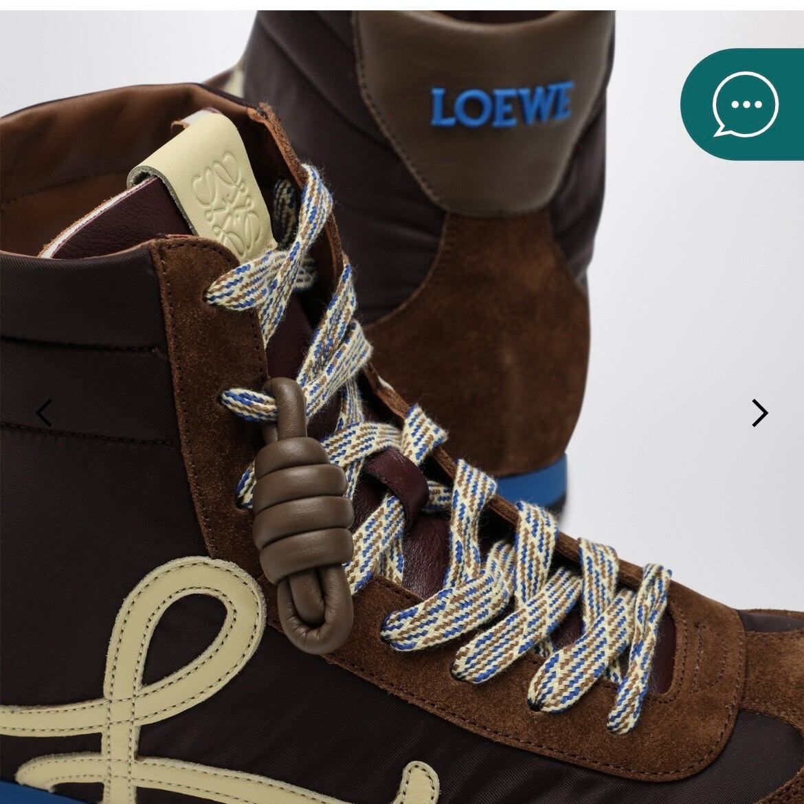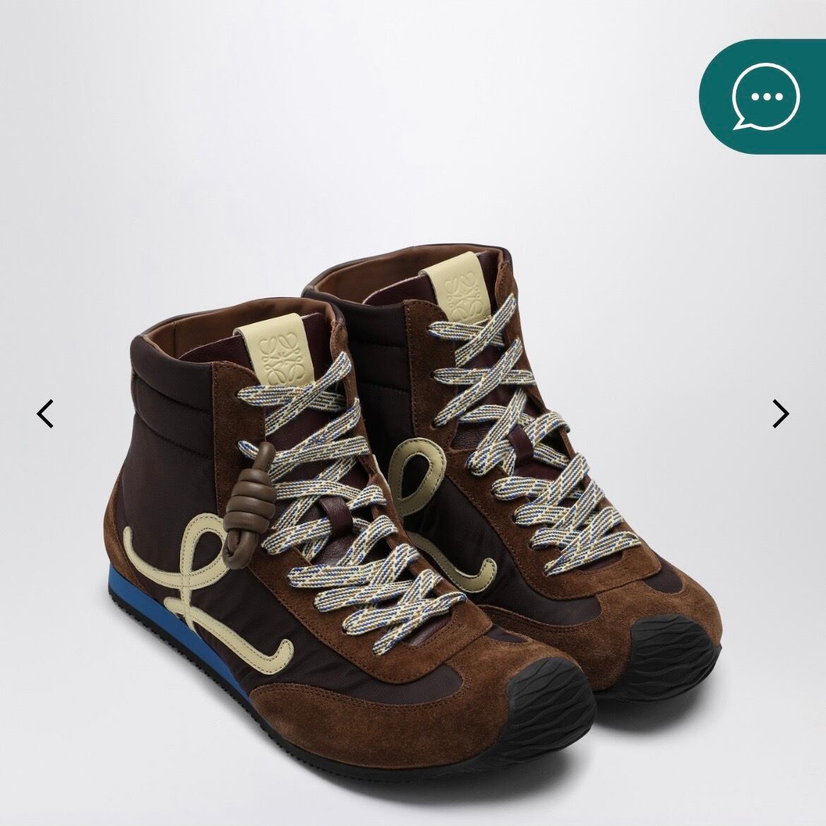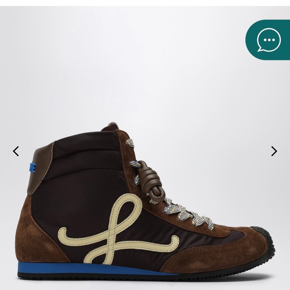 ロエベのブラウンナイロンとカーフスキンを使用したハイカットスニーカー。 アシンメトリーなラウンドトゥ、内側のソックスのような構造、レースアップ留め 具、レザーノットのディテール、サイドとタンにイエローのモノグラム、 背面にブルーのインジェクションレタリングロゴ、ラバーソールが特徴です。