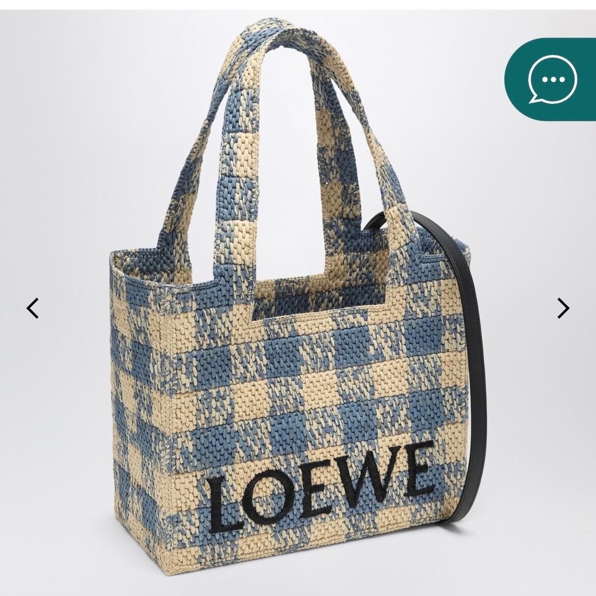 パウラス イビサ カプセルコレクションのロエベ ミディアムトートバッグ。天然ラフィア を使用し、ベージュとブルーのチェック柄が特徴です。フロントにコントラスト の効いたロゴ、2つのトップハンドル、調節可能で取り外し可能な レザーショルダーストラップが特徴です。裏地なしモデルです。
