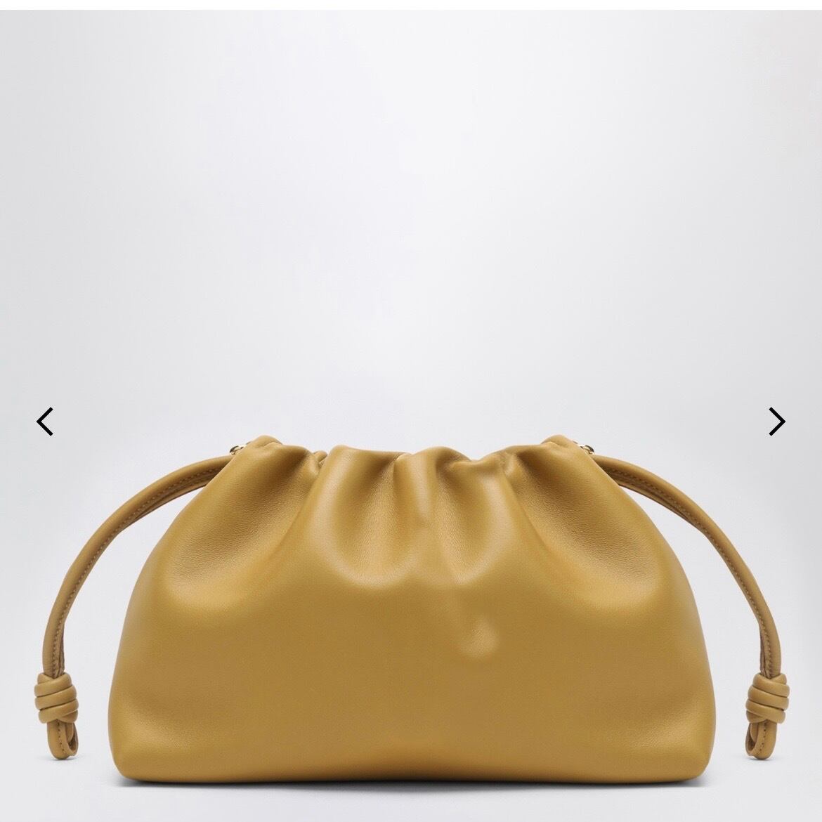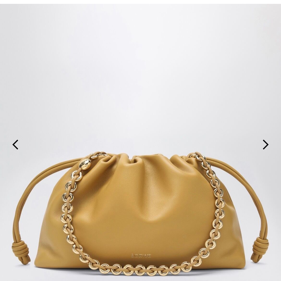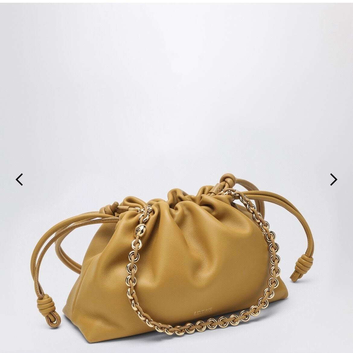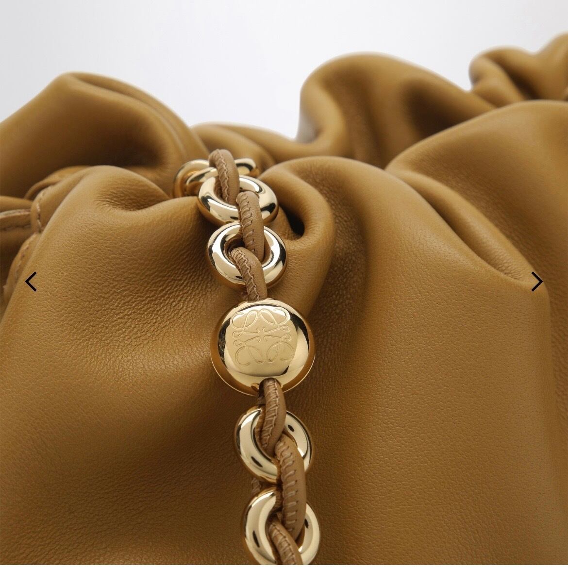 サハラカラーのソフトラムスキンを使用したミディアムサイズのロエベバッグ。 サイドにノットが付いたルーシュデザイン、調節・取り外し可能なショルダー ストラップ、ロゴ入りの取り外し可能なゴールドチェーン、マグネット開閉、 フロントにエンボス加工のロゴレタリングが特徴です。
