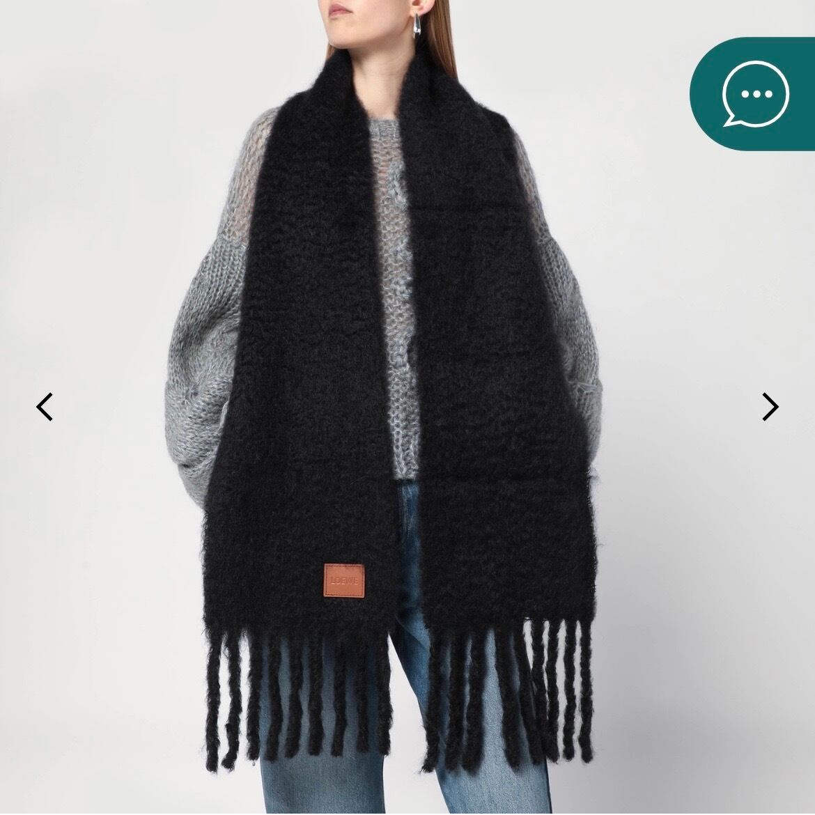ロエベのブラック ウール&モヘア スカーフ。フロントに装飾的なフリンジ とレザーのアナグラムパッチが特徴です。