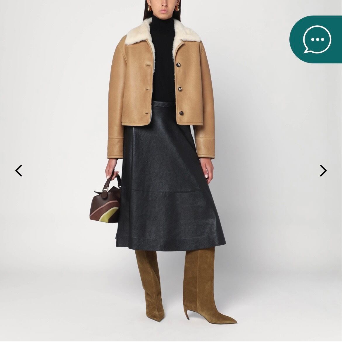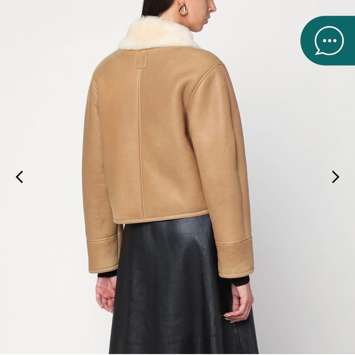 ロエベのショートコート。滑らかなベージュのキャメルメリノ シアリングを使用。ワイドカラー、長袖、フロントボタン留め、ウェルトポケット 2つ、背面にアナグラムロゴ入りレザーパッチ、レギュラーフィットが 特徴です。