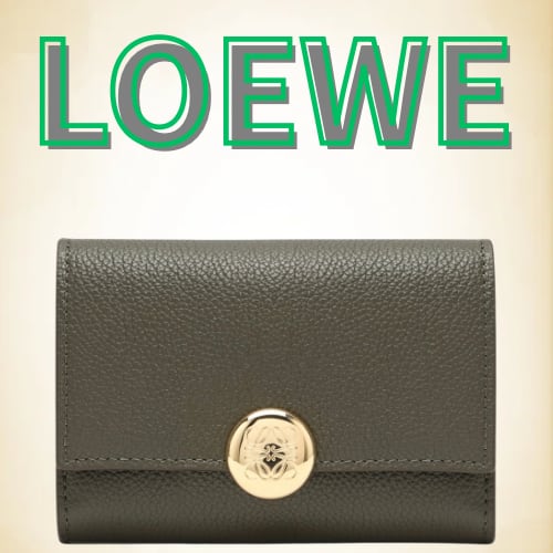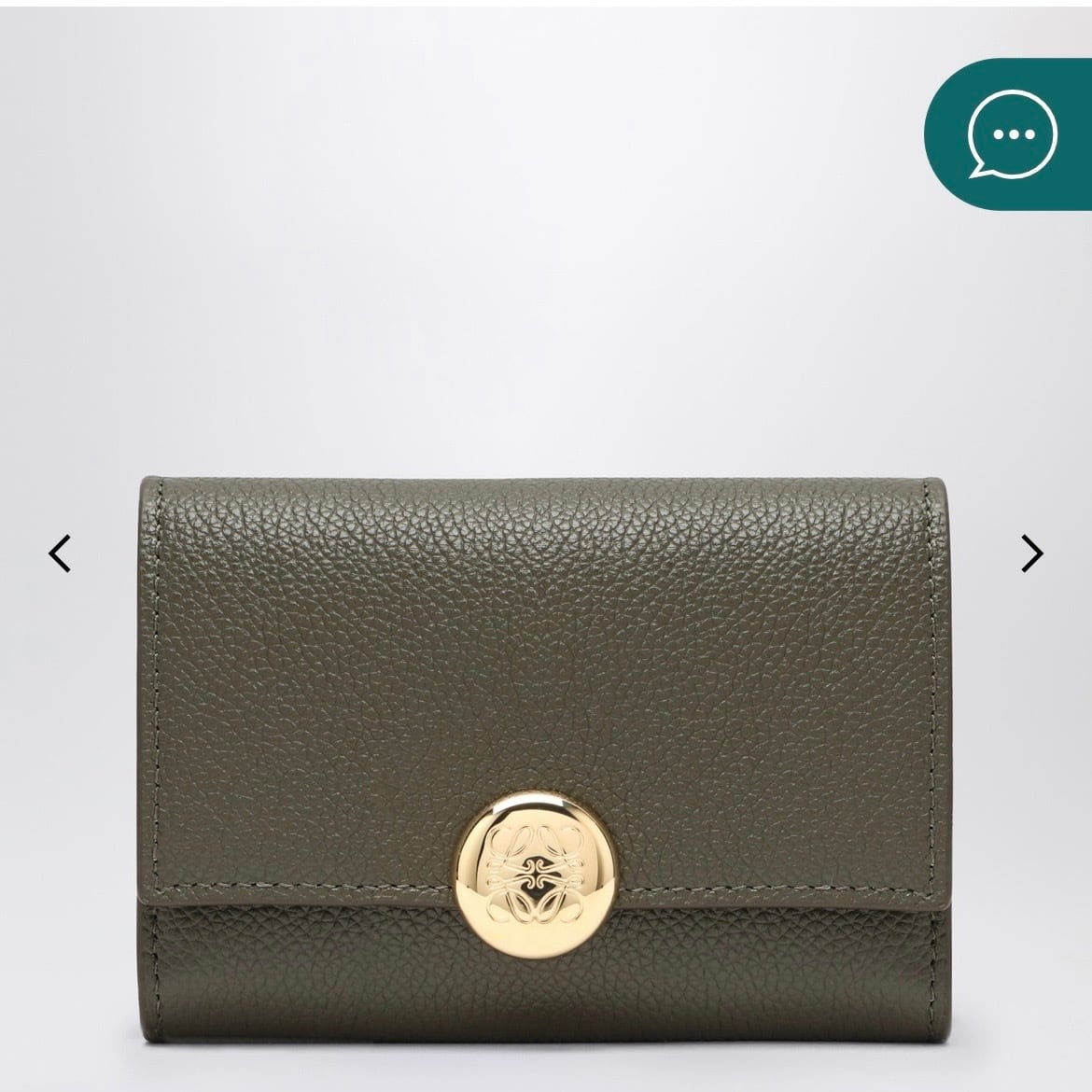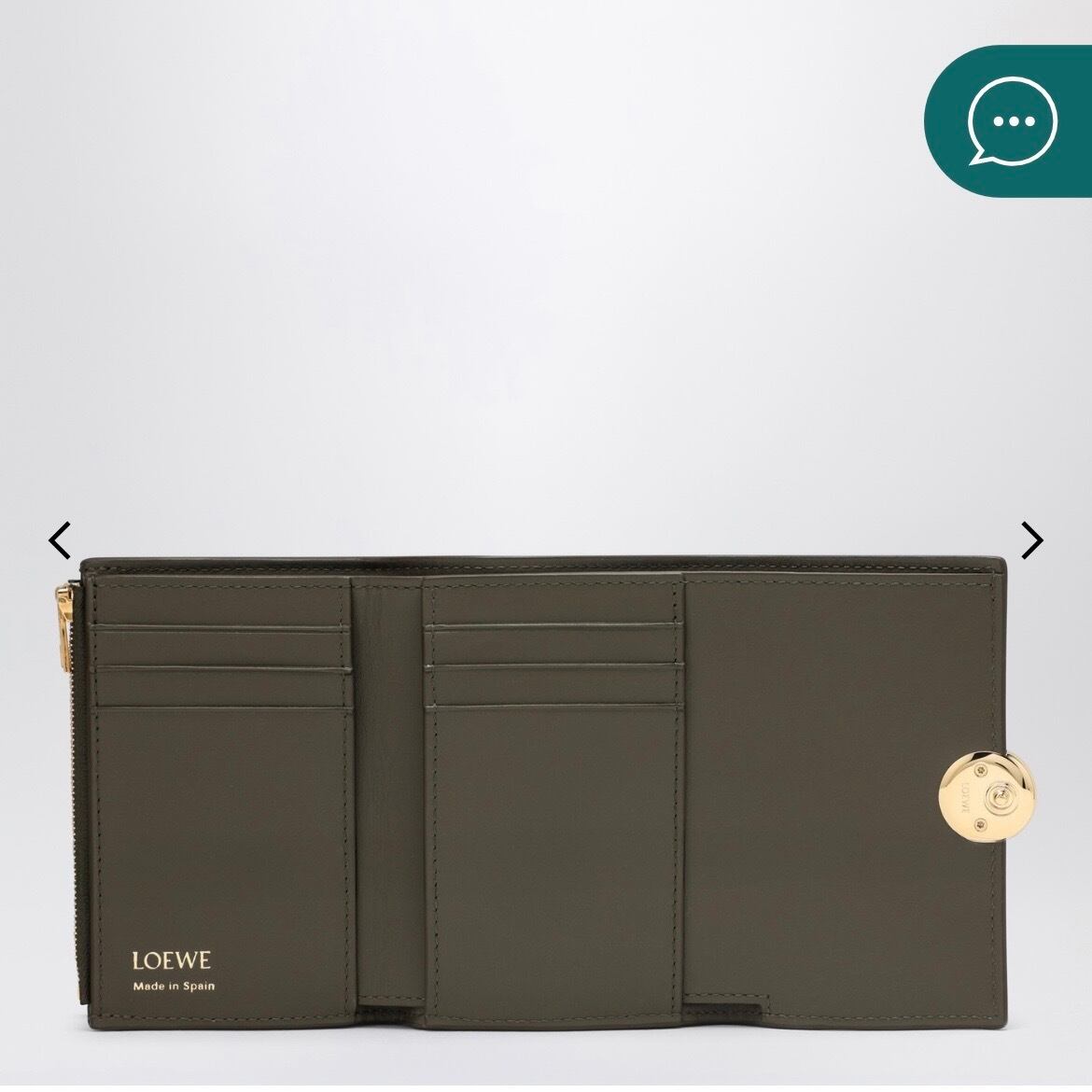 カーキ色のハンマードカーフスキンを使用したロエベのスモールウォレット。カードスロット6 つ、小さなポケット2つ、大きなポケット1つ、ジッパー付きコインコンパートメント、 スナップボタン留めのアナグラム ペブルが特徴です。